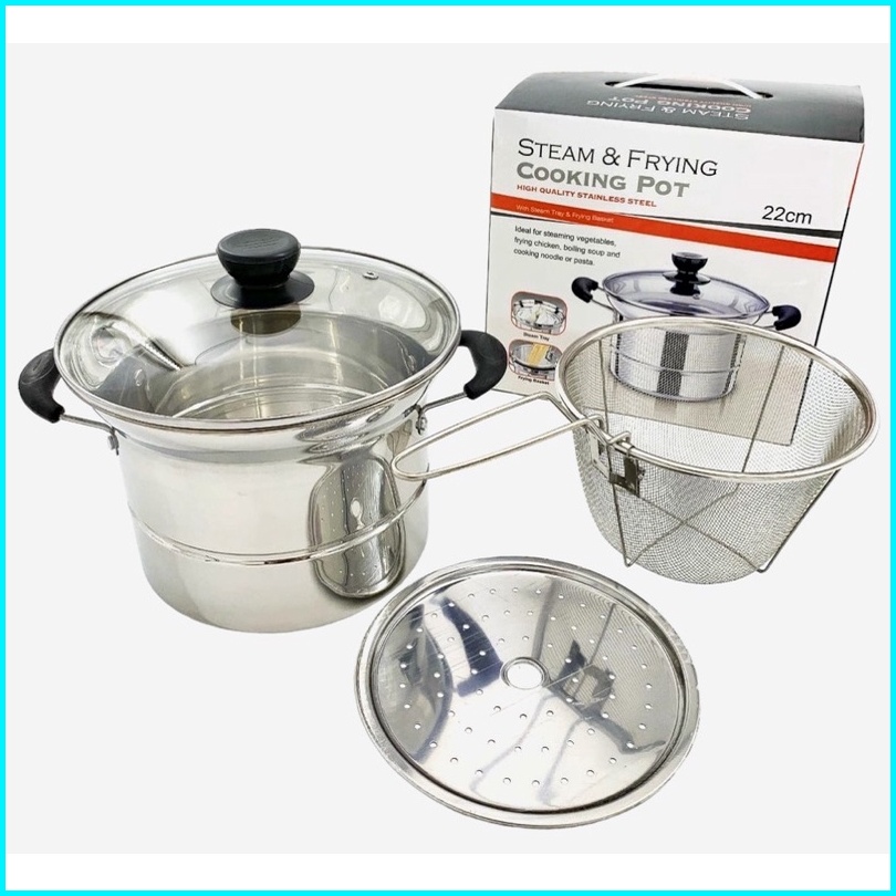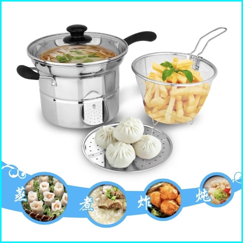 Is - Panci 3in1 Goreng Rebus - Deep Fryer Gagang Panjang Kuping 2 - Panci Mie Stainless - Panci Steamer Multifungsi
