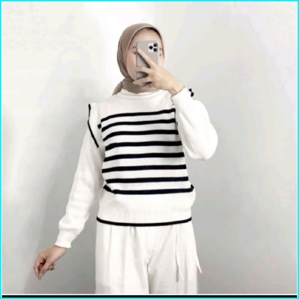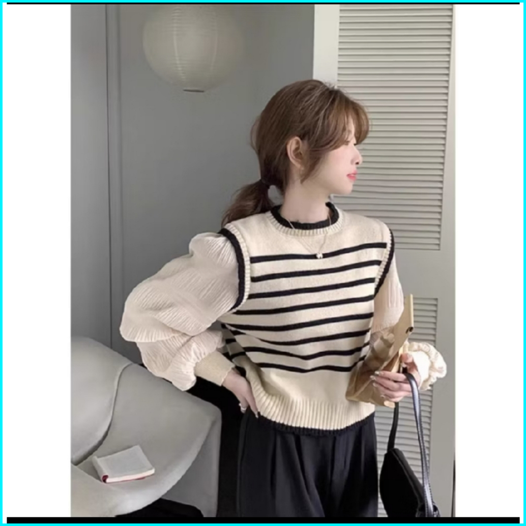 Atasan Knit Wanita Lengan Balon - Sweater Rajut Korean Style Motif Garis