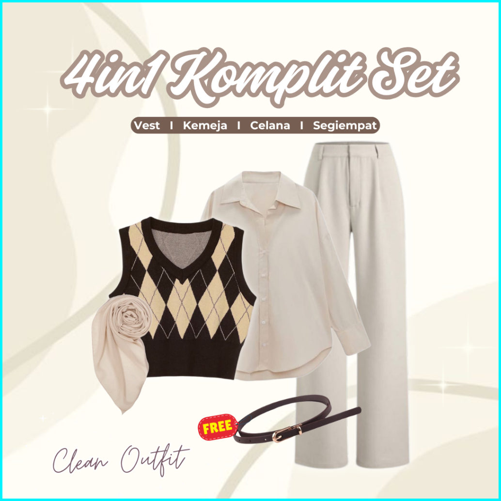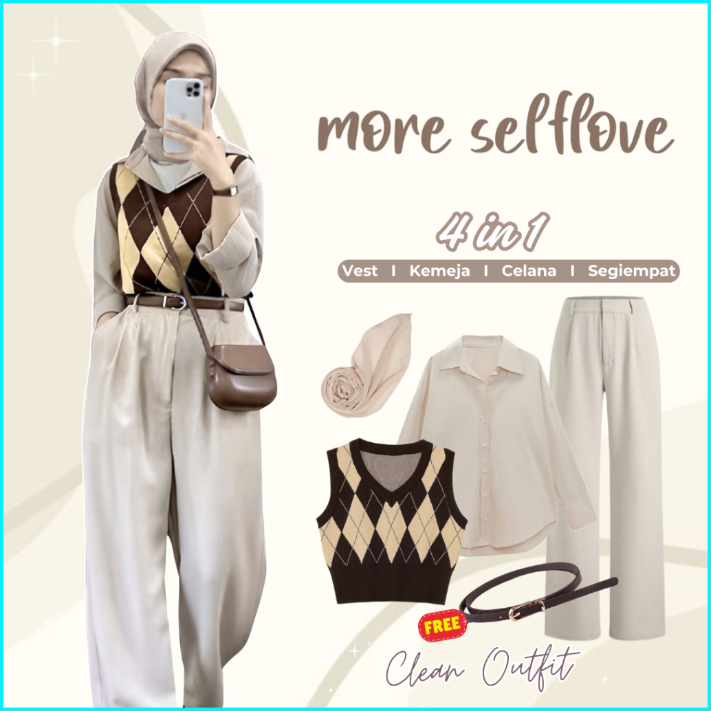 One Set Korean Style 4in1 Vest Kemeja Celana Bella Square Outfit Hijab One Set Hijab Ootd Kekinian L14n