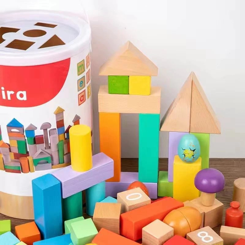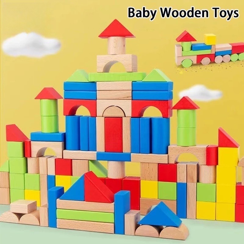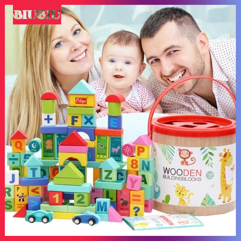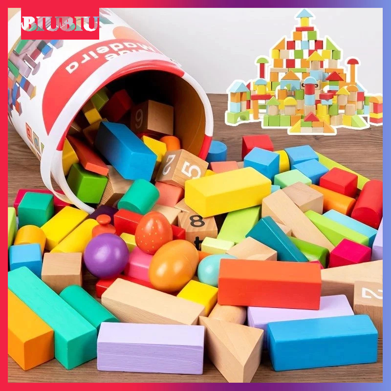 100Pcs Set Balok Susun Kayu Dengan Tas Penyimpanan Mainan Kayu Untuk Anak-Anak Balok Susun Rakitan Mainan Pendidi