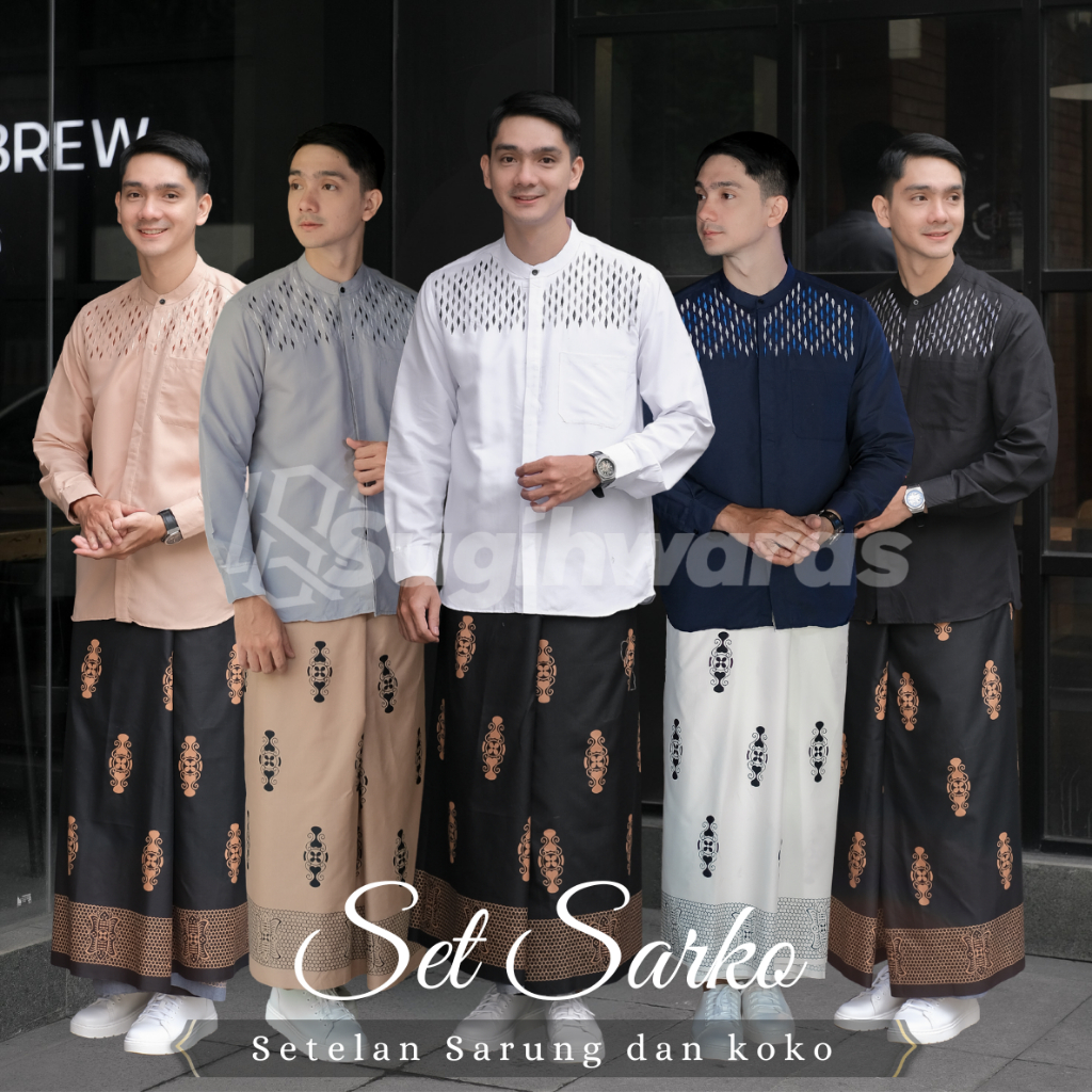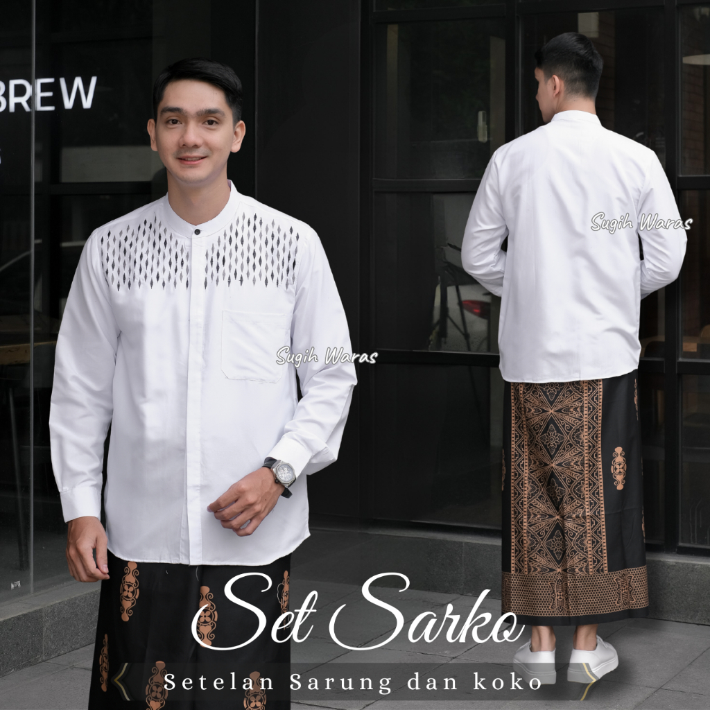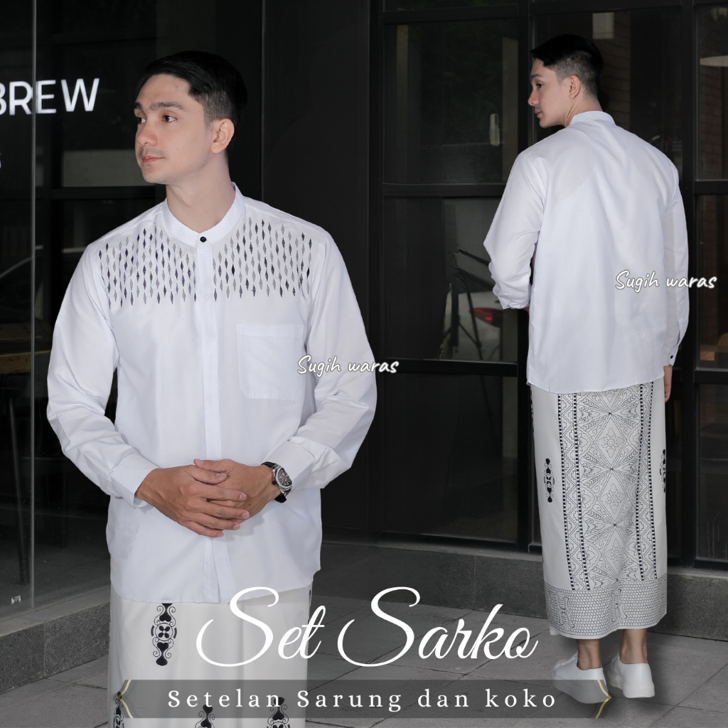 Set Sarko Setelan Sarung Dan Koko Bordir Lengan Panjang Bahan Katun Pakaian Muslim Pria Terbaru