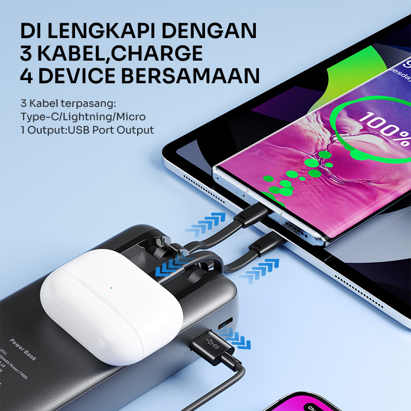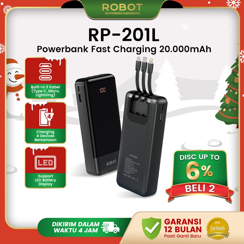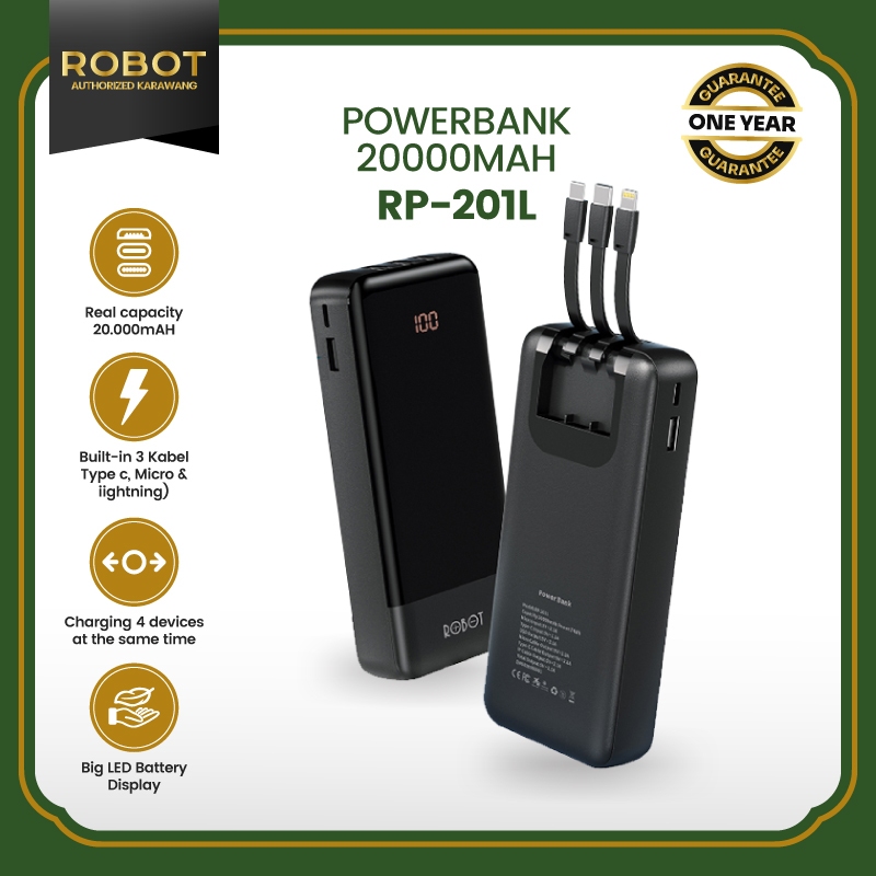 ROBOT WER 20000MAH 2.1A 3 BUILT-IN KABEL TYPE C LIGHTNING MICRO LED FOR 4 DEVICE - RP-201L