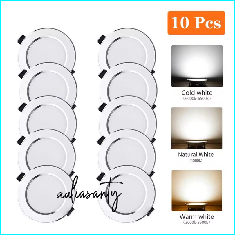 Lampu Downlight 10 Pcs 3 Warna 5w 6w 9w Putih Natural Kuning Inbow Ac 220v Silver