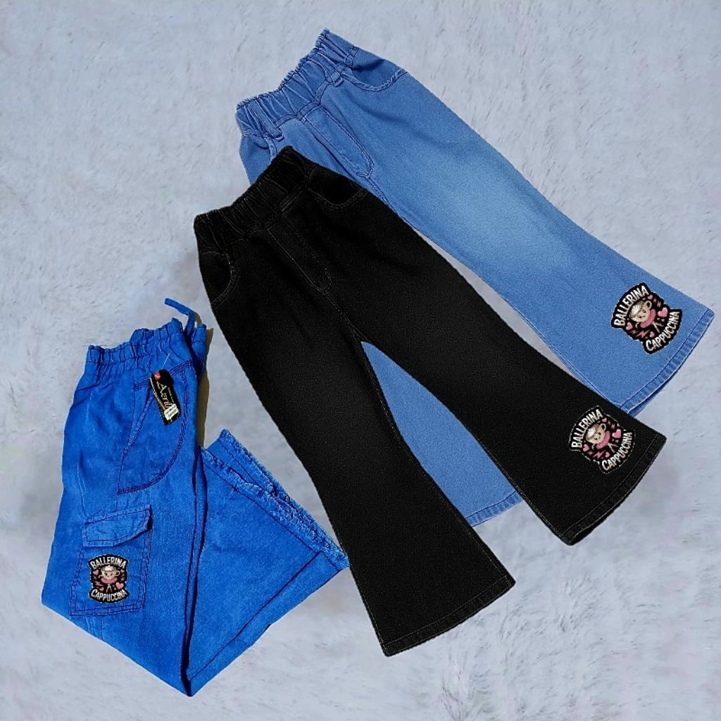 3 Pcs Celana Cutbray Jeans Anak Kulot Cargo Usia 6-17 Tahun Remaja Kuromi Labubu Ballerina Cappucina