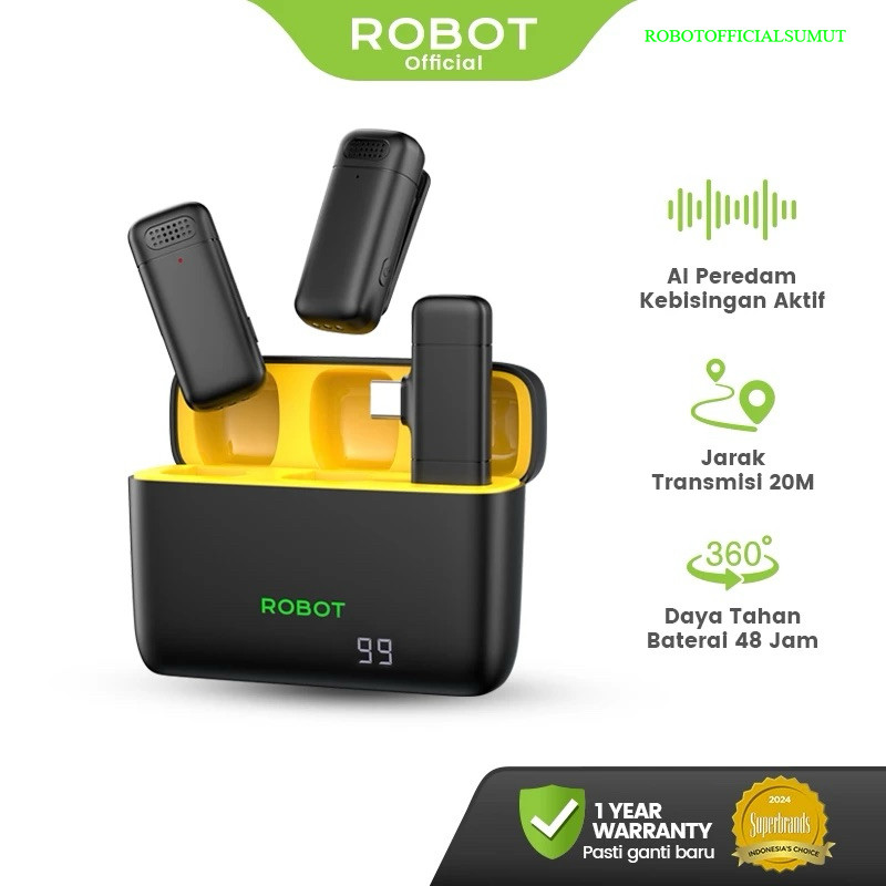 ROBOT RS20 Plus Wireless 1 to 2 Microphone Clip On Live Vlog Youtuber Live Stream dll AI Peredam Kebisingan Plug Type-C