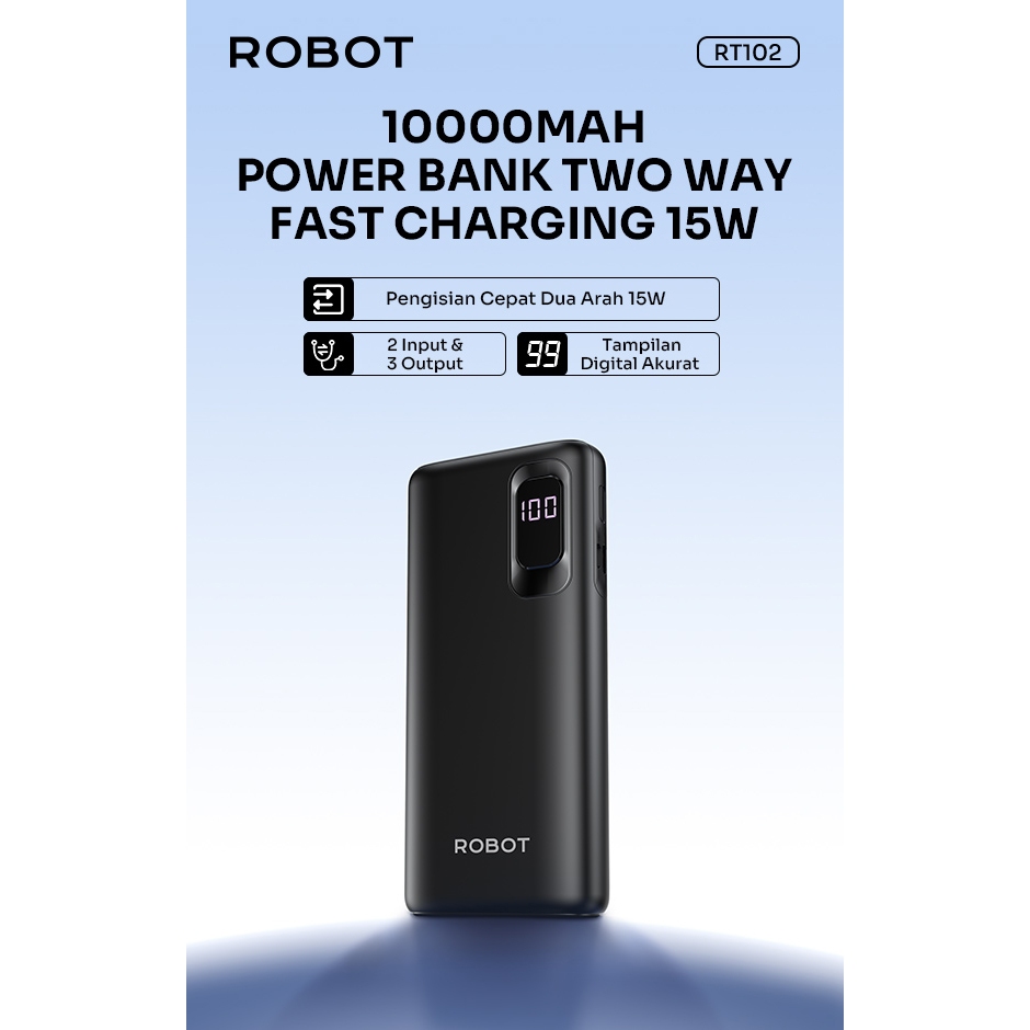 ROBOT RT102 WER 10000MAH 15W 5V 3A MAX DUAL INPUT RT USB-C & MICRO USB REAL CAPTY LED DISPLAY NEW MODEL RT12 RT180 RT190S - RESMI 1 TAHUN