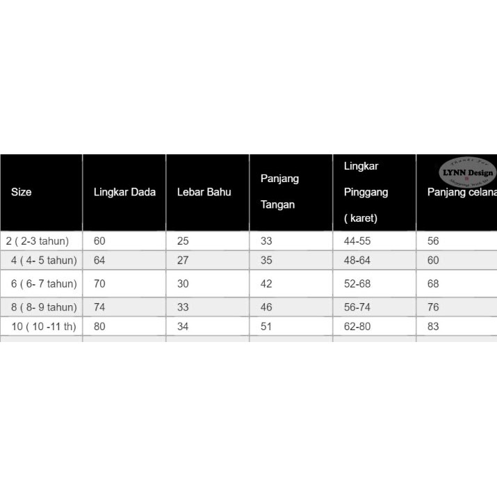 Uk. 2 ( 2-3 tahun), Uk. 4 ( 3- 4 tahun), Uk. 6 ( 5-6 tahun), Uk. 8 ( 7- 8 tahun), Uk. 10 (9-10 tahun), Uk 12 ( 11-12 tahun), Uk 14 (13-14 tahun), Uk 16 ( 15-16 tahun)