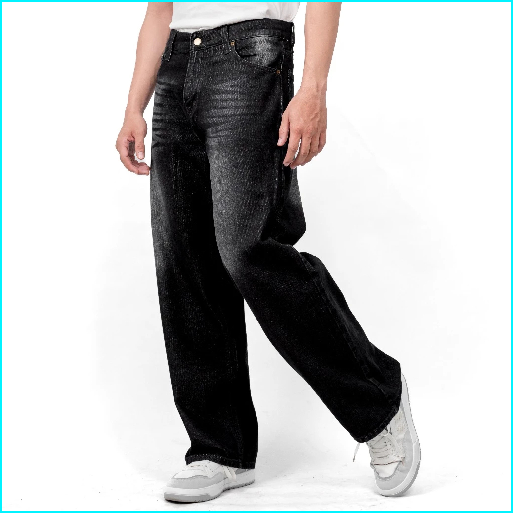 Celana Jeans Panjang Pria Wide Leg Lebar Gombrong Skena Black Wisker Loose Fit Jumbo Big Bahan Denim