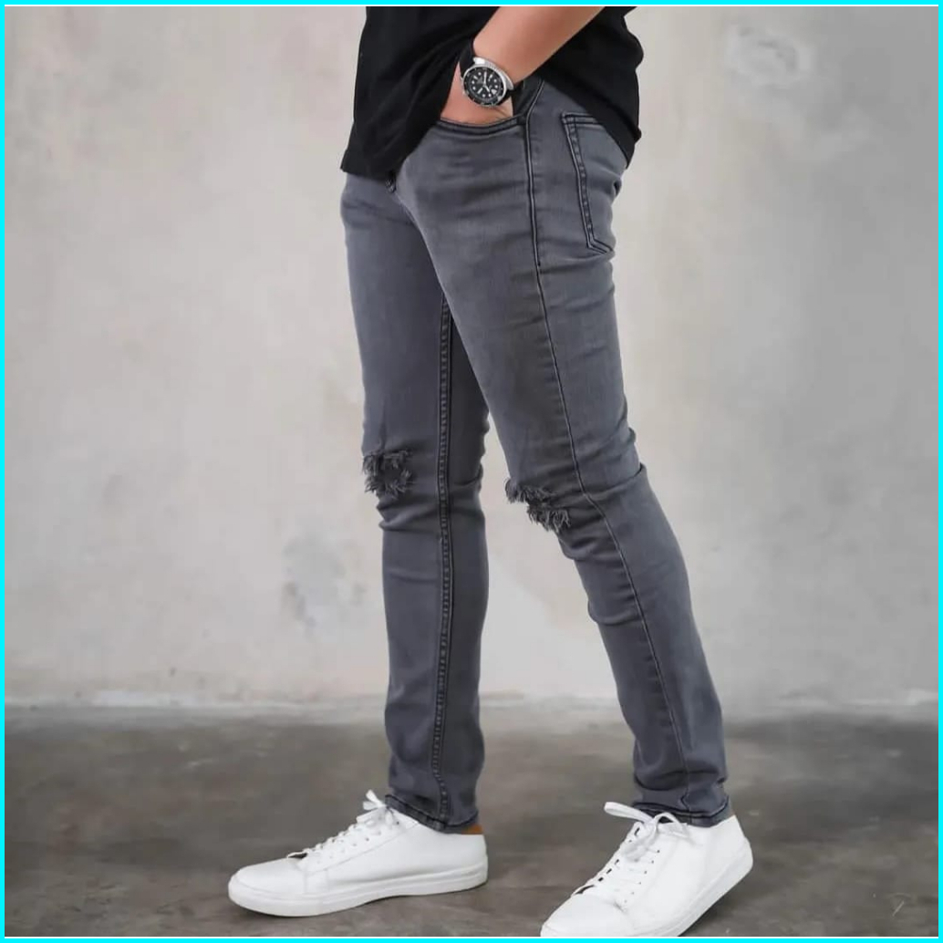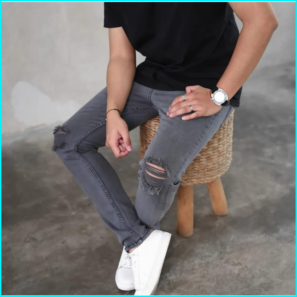 Celana Jeans Ripped Abu Sobek Lutut Pria Model Slim Fit