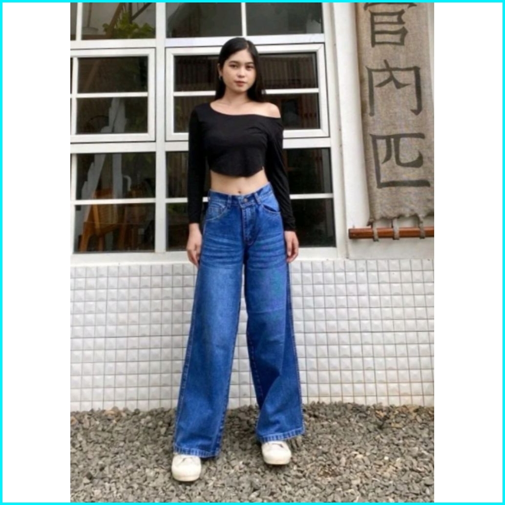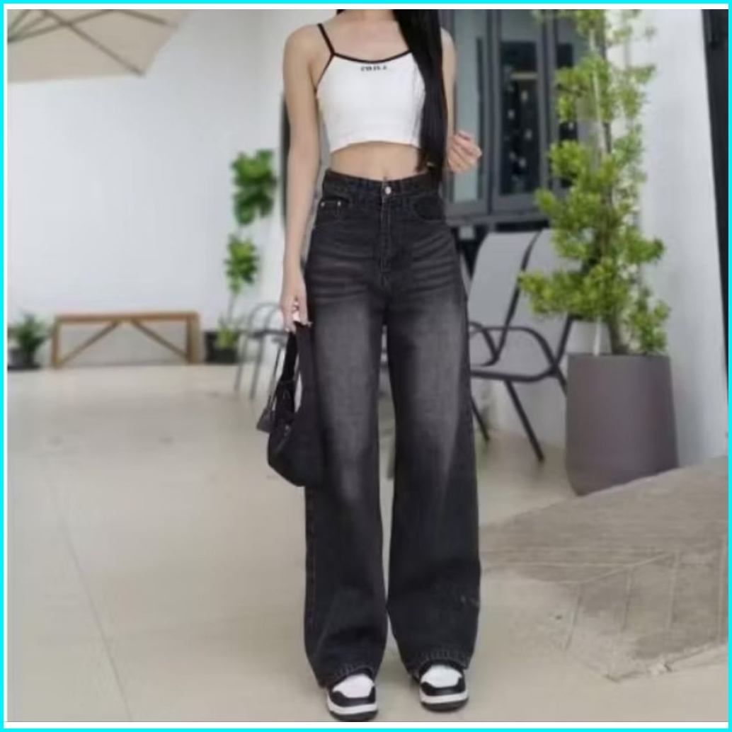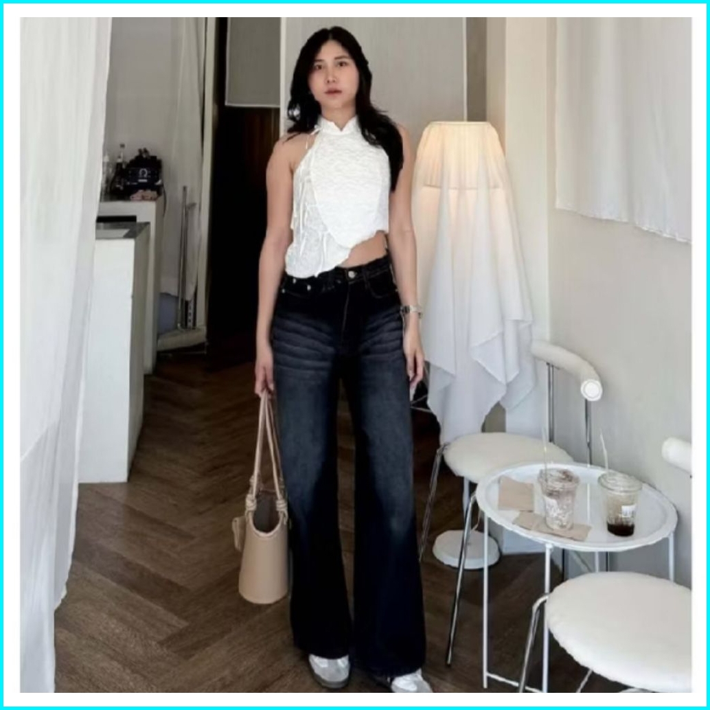 Highwaist Baggy Jeans Retro Wanita Vintage Celana Kulot Loose Skena Korean Style Wisker Non Strech Panjang Hitam