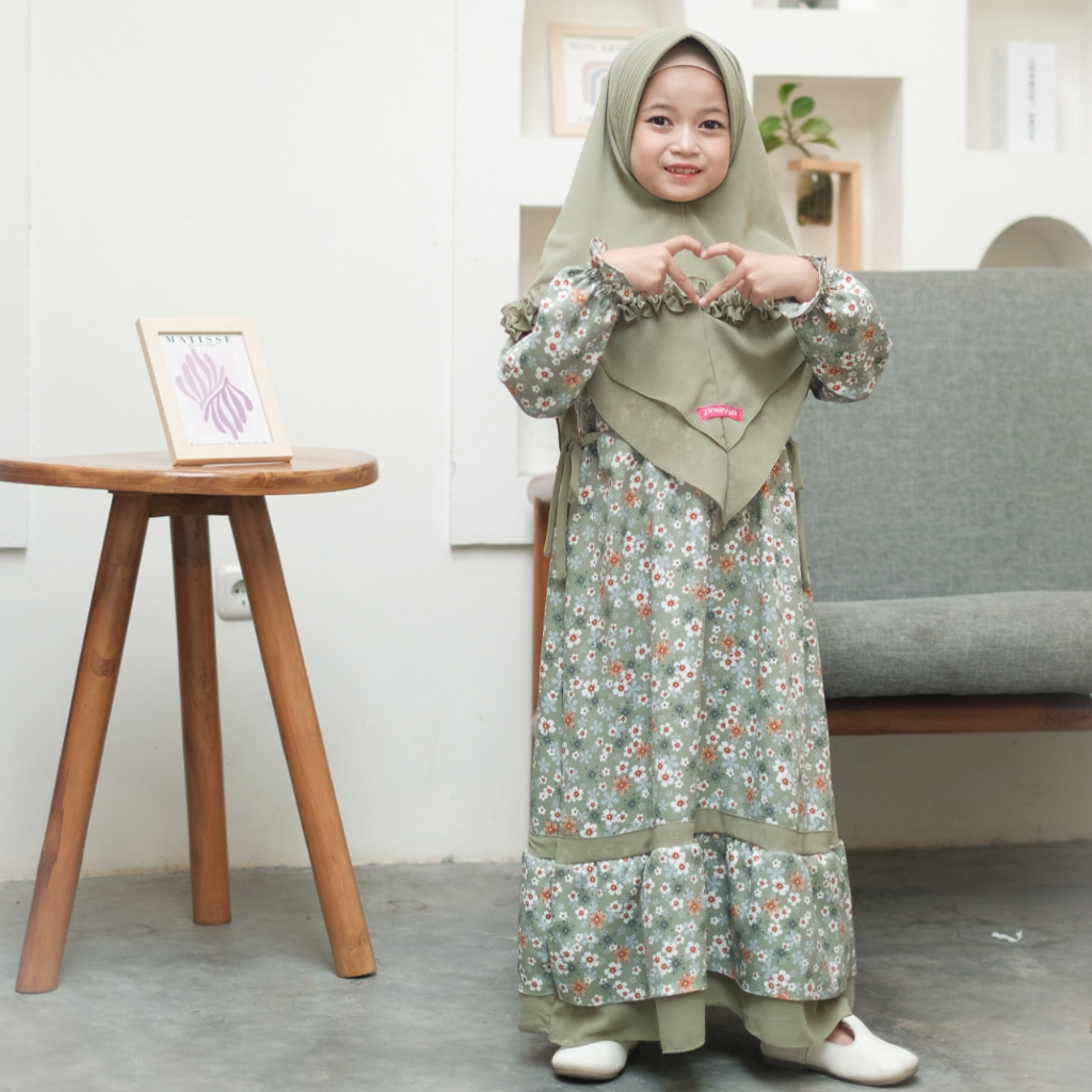 Gamis Anak Sumayyah Set Plus Hijab Syar'i Usia 3 Sampai 10 Tahun Bahan Shakila Mix Ceruty Babydoll