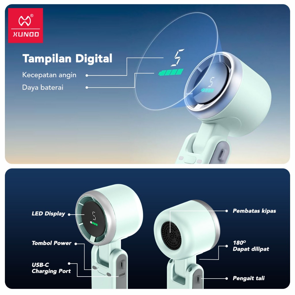 XUNDD Mini Kipas Folding / Foldable Neck Hanging / LED Display Handheld Portable Fan / 5 Speeds Adjustable Foldable Small Desk Fan / 3600mAh USB Rechargeable Powerful Cooling Turbo Fan XDOT-065