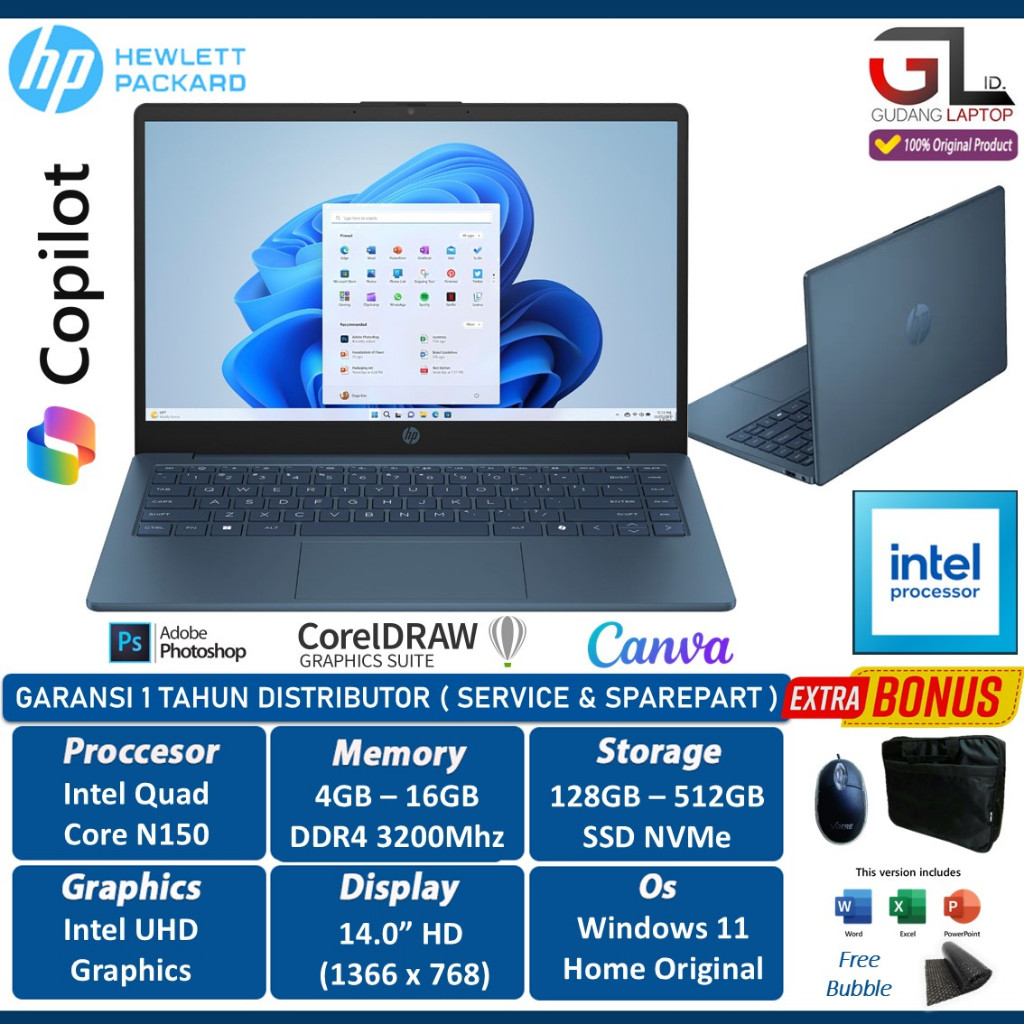 Laptop Terbaru HP 14 Intel Core N150 RAM 16GB 512GB SSD 14.0HD Win 11 Home