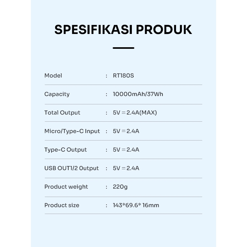 ROBOT WER 10000MAH 3 PUT DUAL INPUT TYPE-C WER RT180S FAST CHARGING 12W ANDROID/IPHONE - RESMI 1 TAHUN