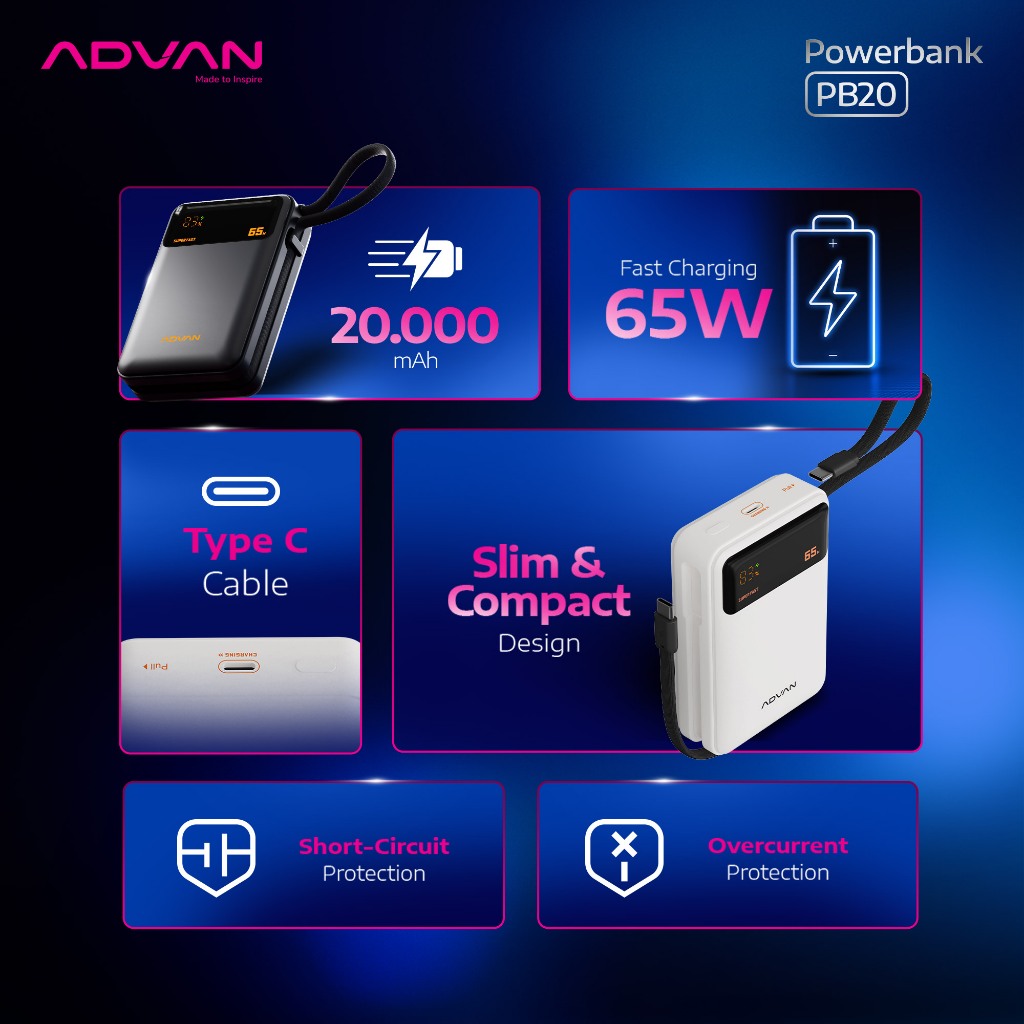 ADVAN WER PB20 | 20.000MAH | 65W SUPER FAST CHARGING | BUILT-IN TYPE-C CABLE | DUAL RT | SLIM & COMPACT DESIGN | SHORT CIRCUIT PROTECTION | RESMI 1 TAHUN