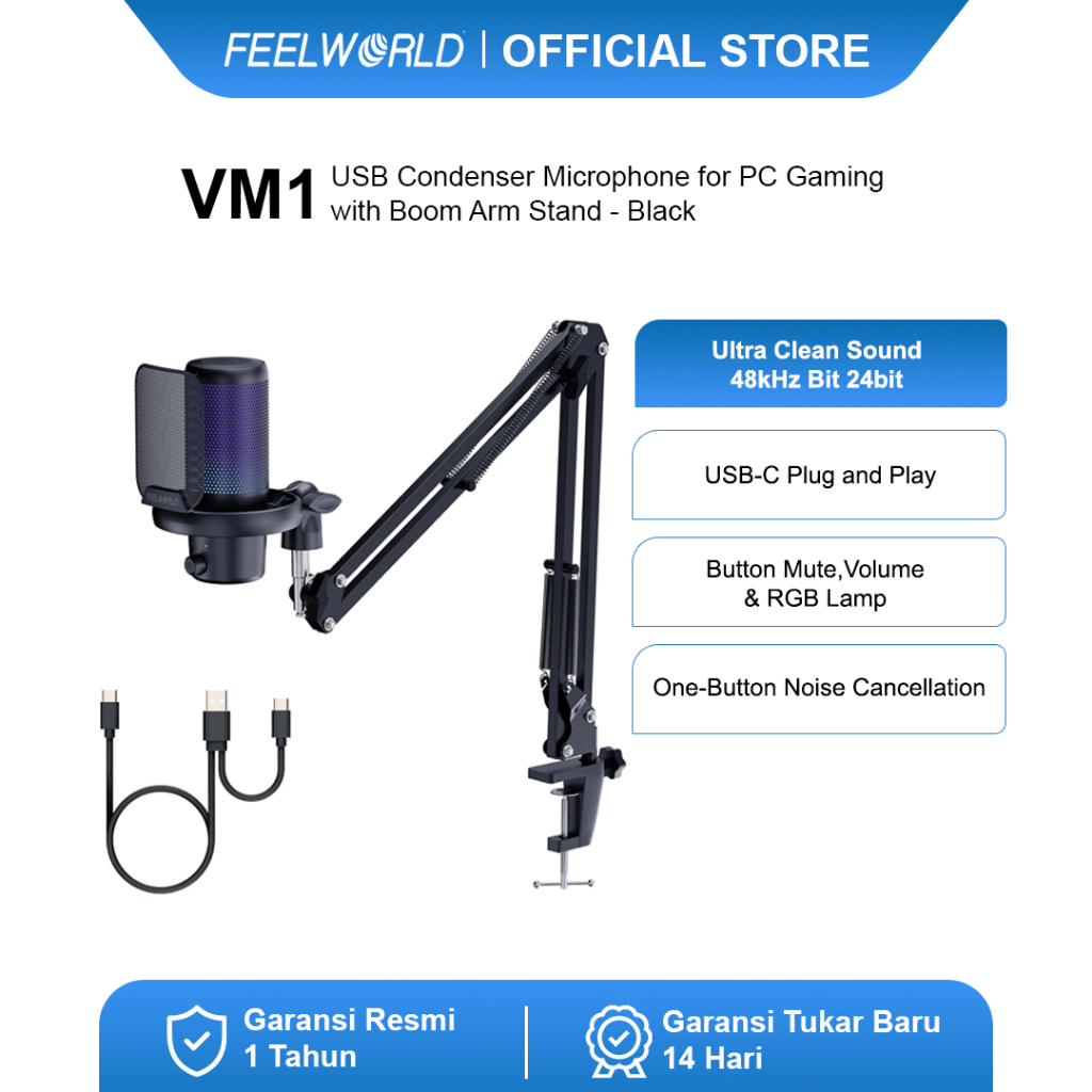 FEELWORLD VM1 USB Condenser Microphone for PC Gaming with Boom Arm Stand - Black