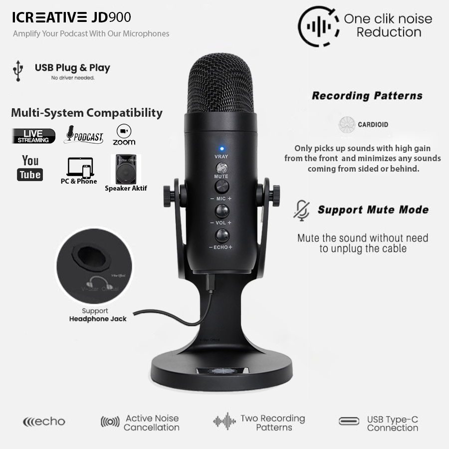 Microphone Condenser USB Podcast Gaming Mikrofon Kabel PC Laptop ICREATIVE JD900 Youtuber