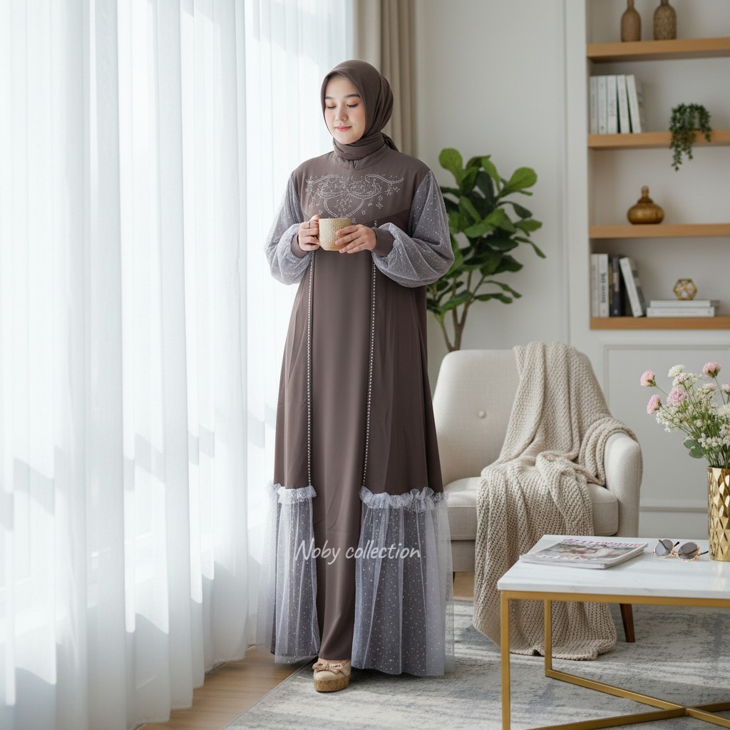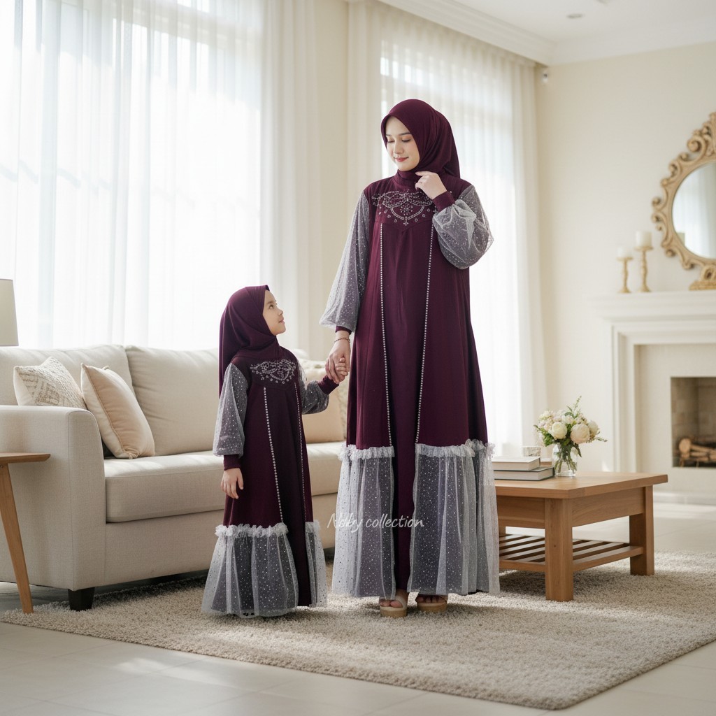Gamis Abaya Mecca Model Terbaru Set Hijab Baju Hari Raya 2026 Anak Perempuan Bahan Marbela Anti UV Mix Tile Raindrop