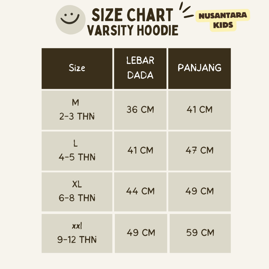 M 2-3 TAHUN, L 4-5 TAHUN, XL 6-8 TAHUN, XXL 8-12 TAHUN