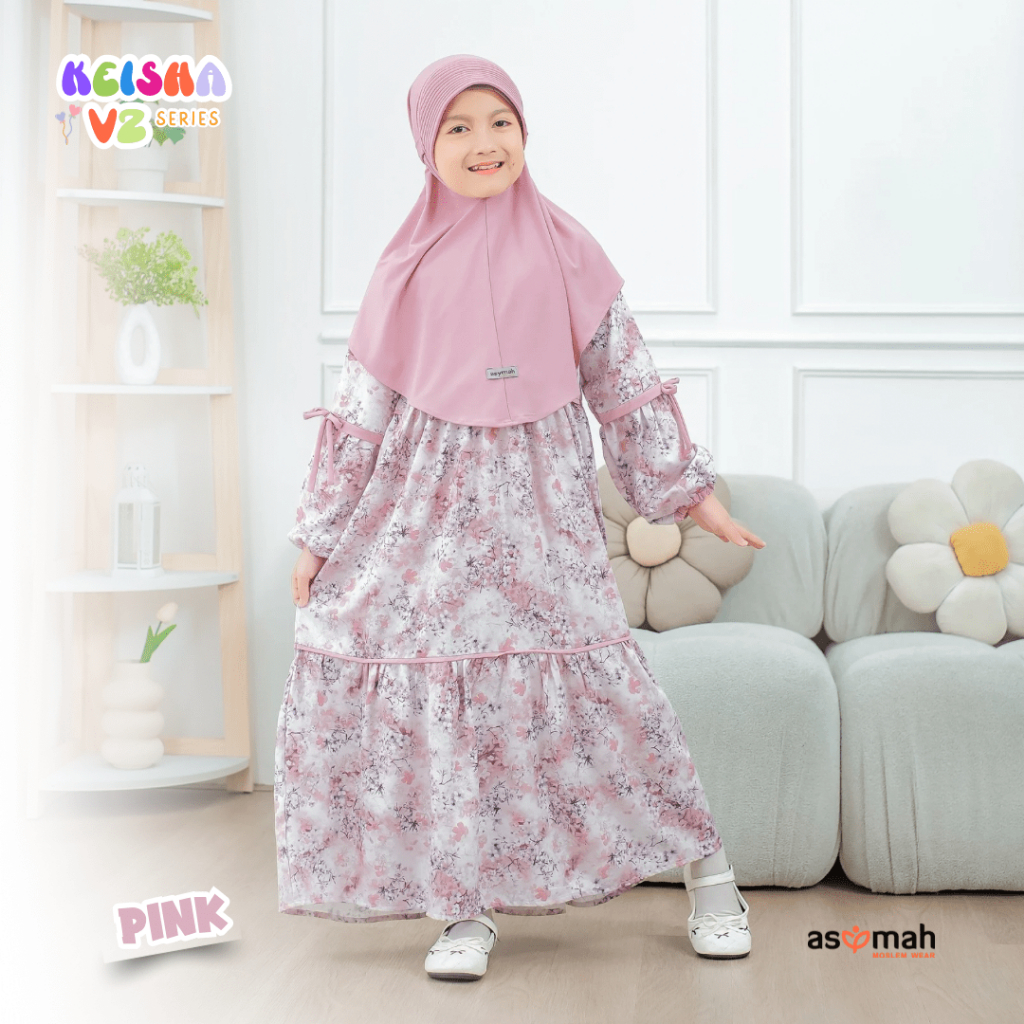 ASYMAH Baju Gamis Pink Anak Perempuan Set Kerudung Keisha V2 Dress Syari Mewah Motif Bunga Lionelrichi