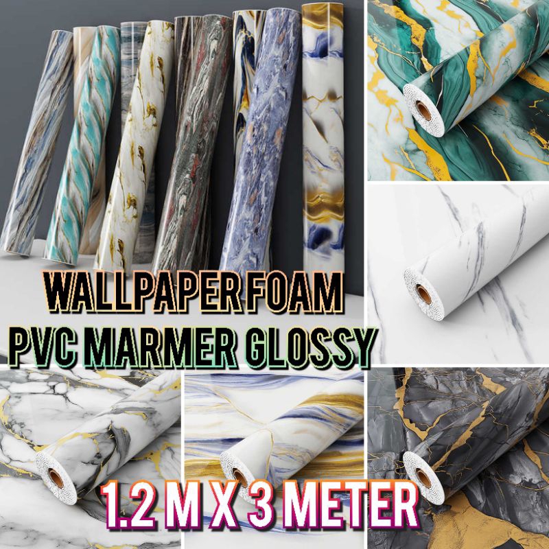 Wallpaper Dinding Foam Vinyl PVC 1.2 x 3 Meter Marmer Marbel Glossy Mewah Elegan Modern Kekinian