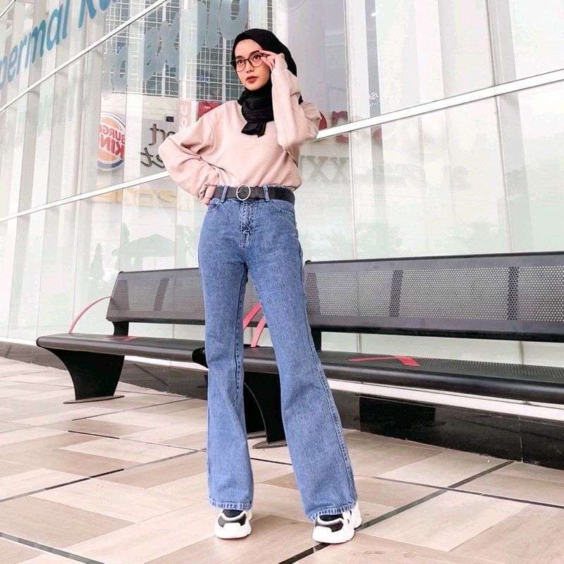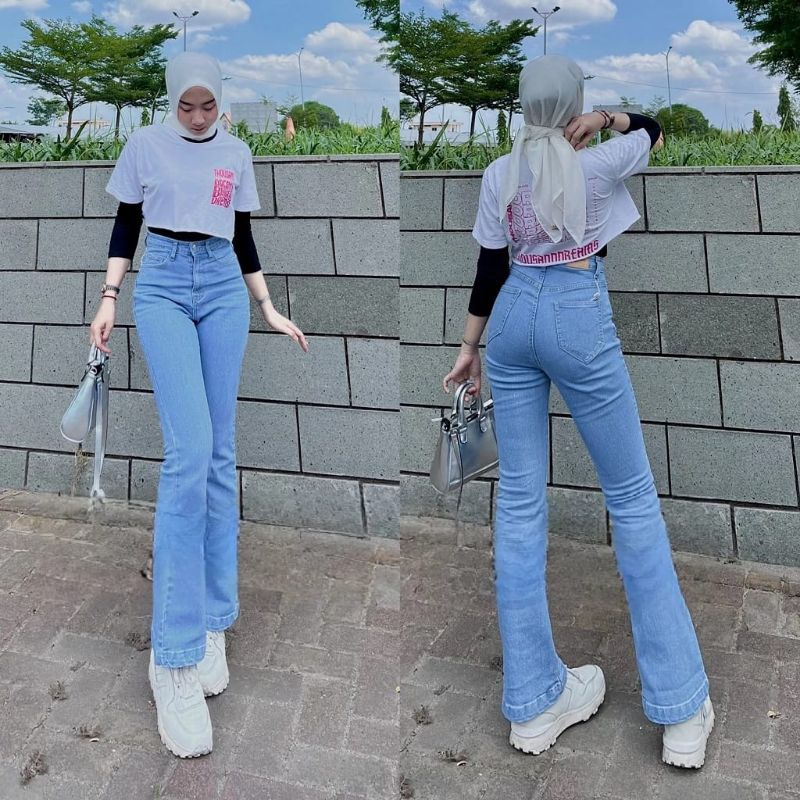 Highwaist Cutbray Jeans Loose Wanita Retro Stretch