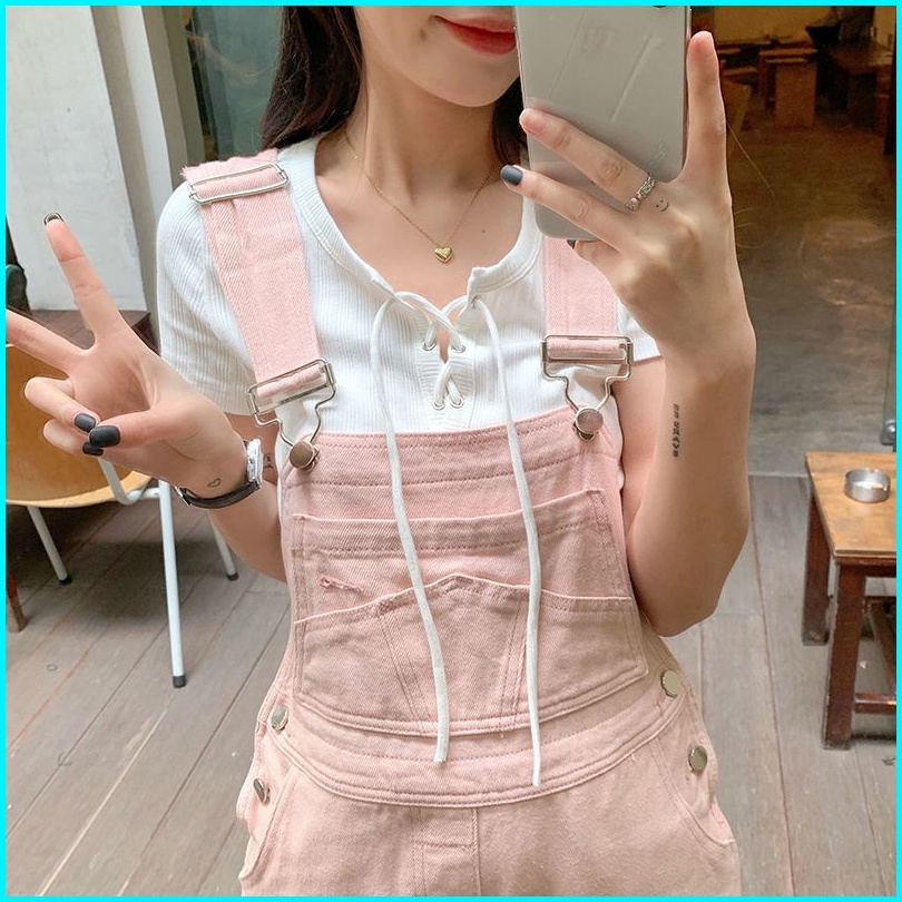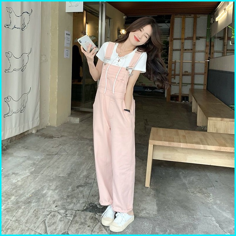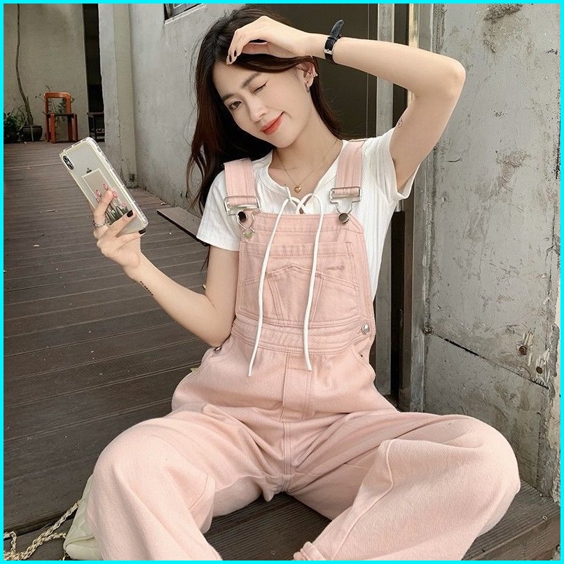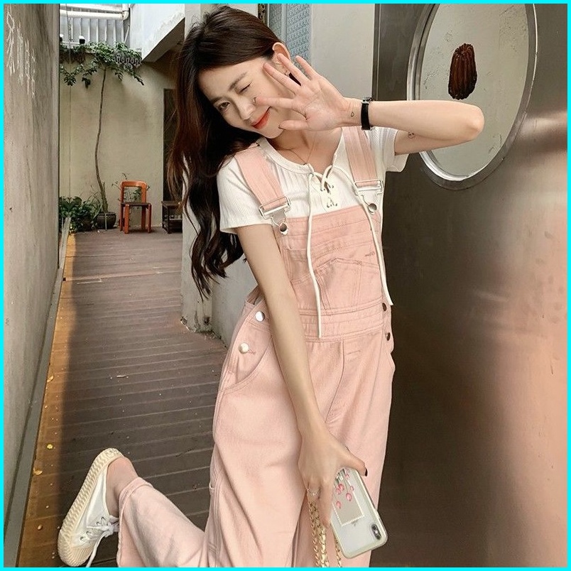 Terusan Denim Merah Muda Versi Korea Wanita Longgar Jumpsuit Kaki Lurus Berpinggang Kecil Kecil