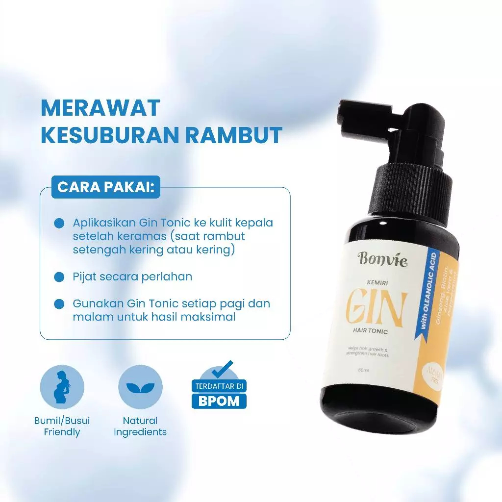 Promo Bonvie Anti Hairfall Kemiri Gin Hair Tonic (60ml) with Oleanolic Acid, Biotin, Ginseng, Kemiri, Peppermint & Aloe Vera