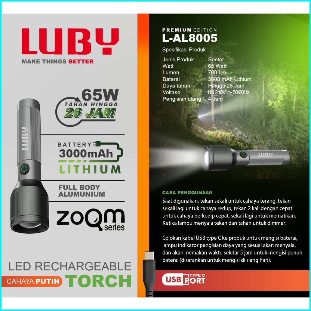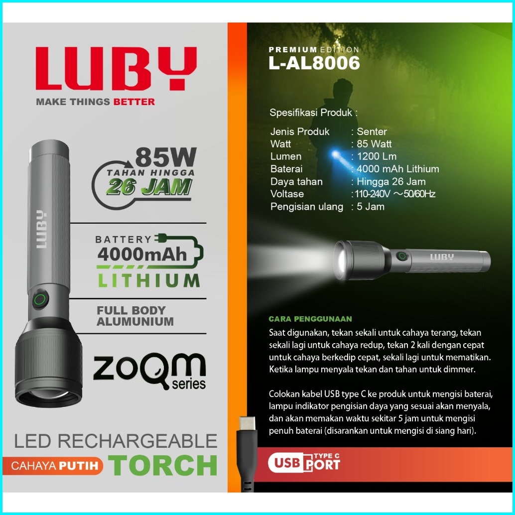 Senter Led Luby L-al8006 85watt 4000mah Tahan Hingga 26jam - Zoom Jarak Jauh - Body Alumunium - Charger Usb Type C