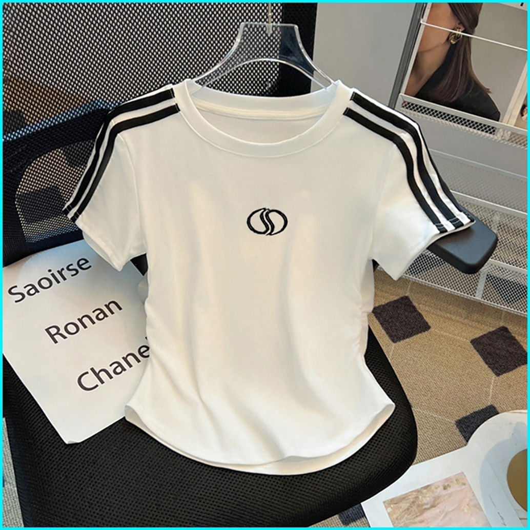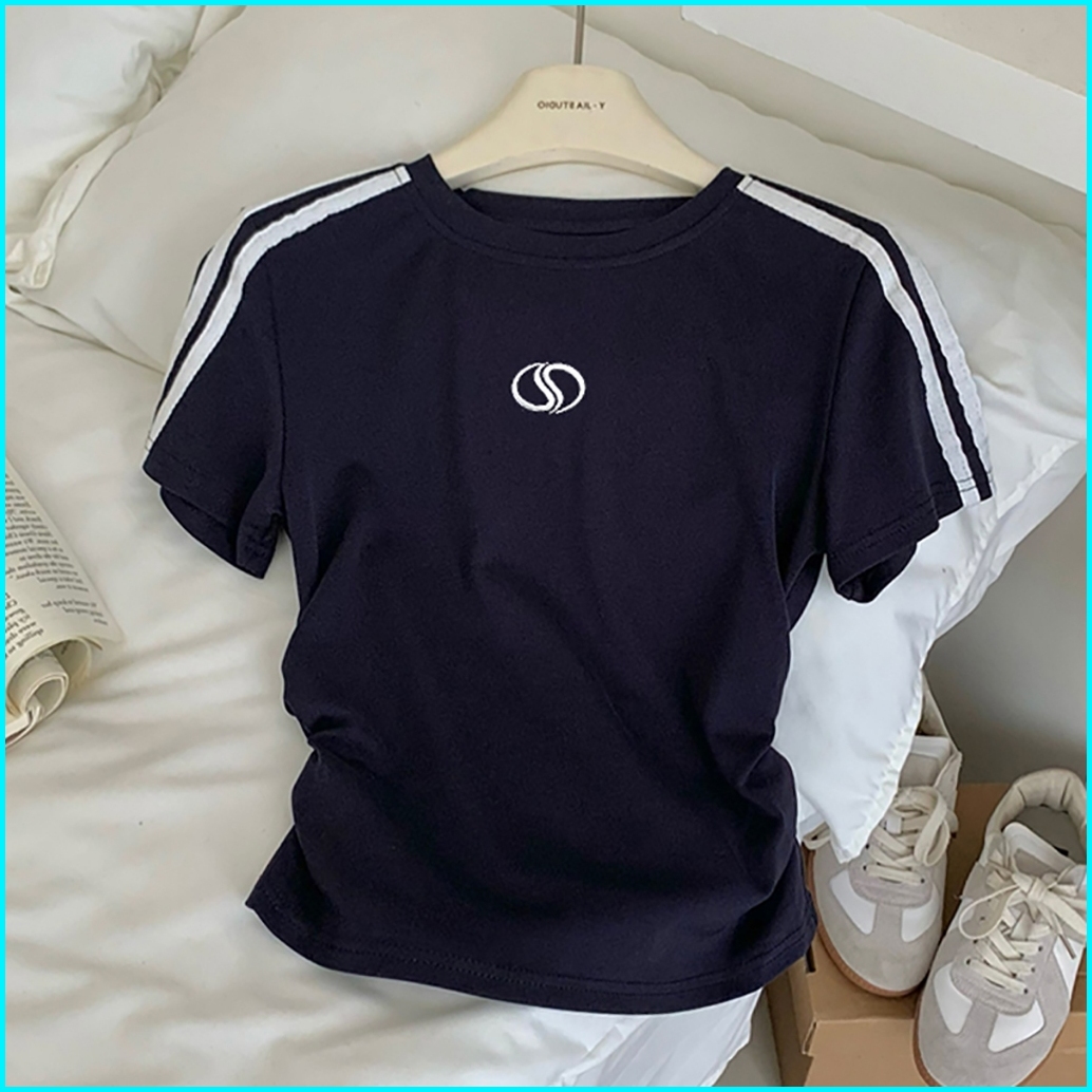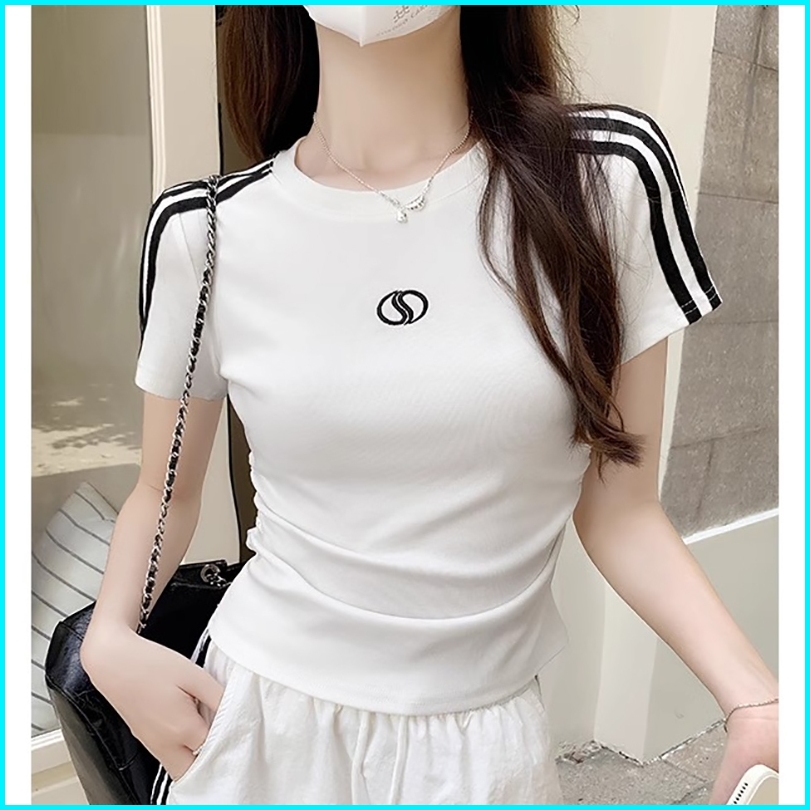 Kaus Lengan Pendek Leher Bulat Bordir Tiga Garis Hitam Baru Atasan Wanita Gaya Korea
