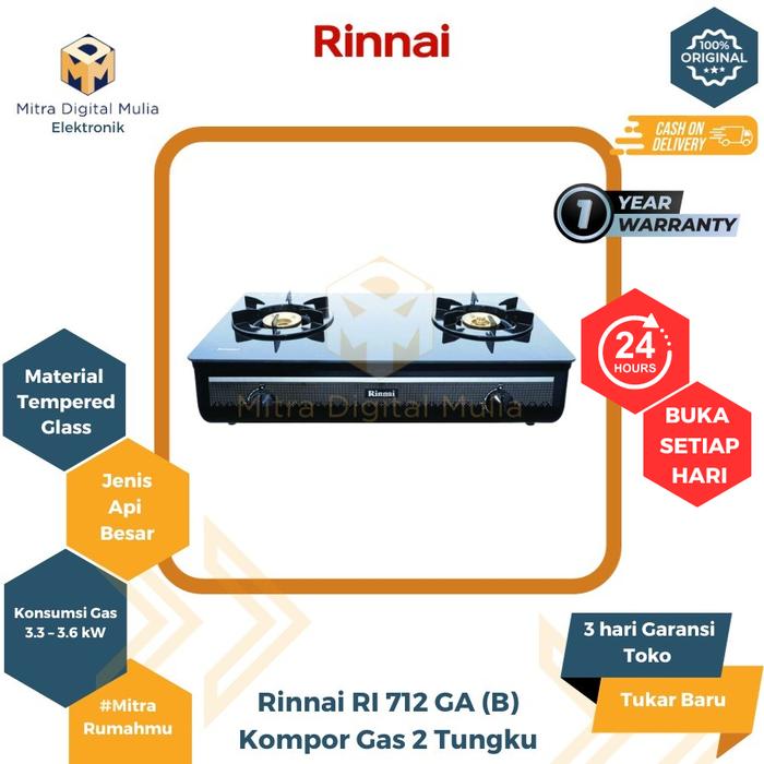 Rinnai RI 712 GA B Kompor Gas dengan Tempered Glass [ 2 Tungku ]