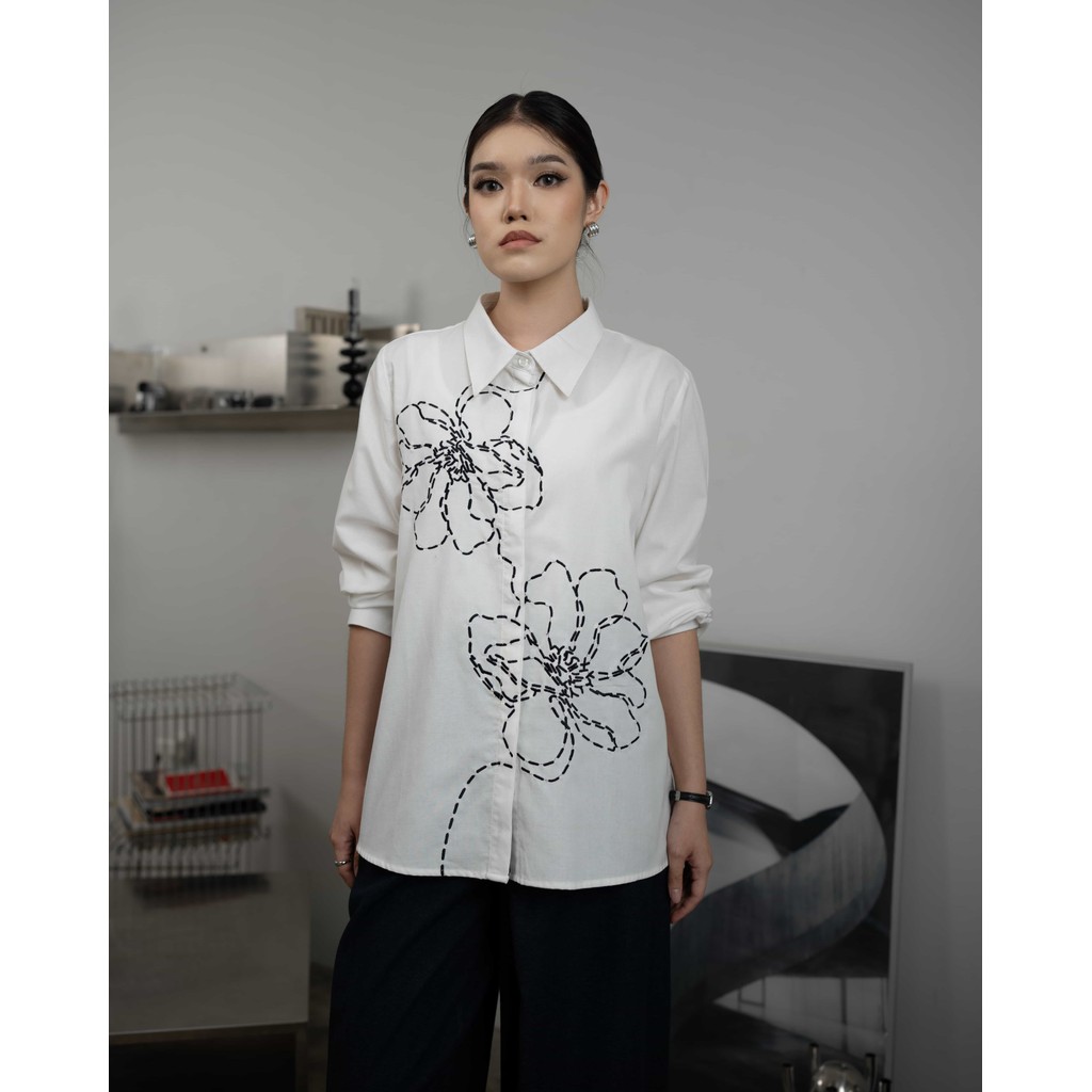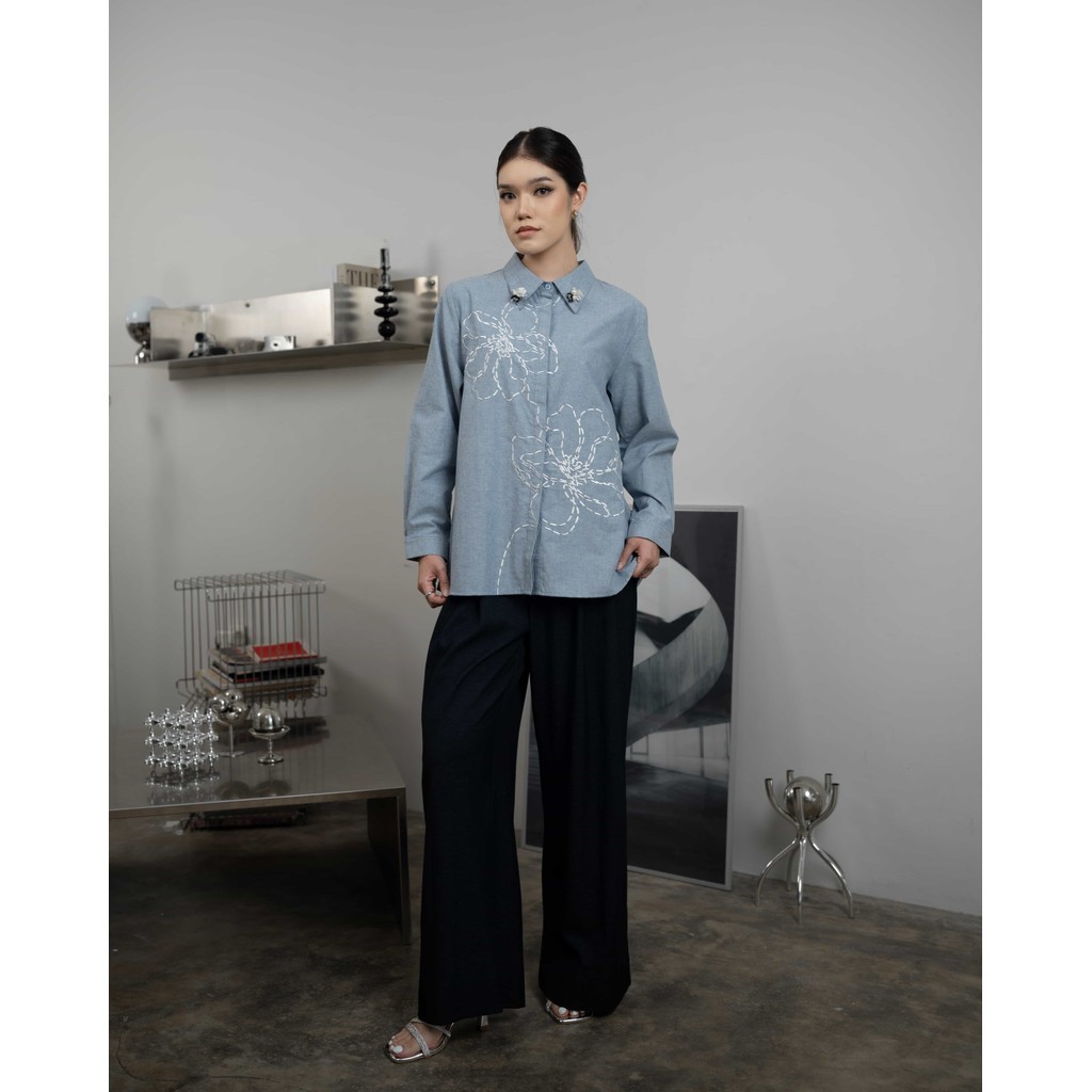Mayoutfit Haniko Shirt | Kemeja Denim Wanita Aksen Bordir Floral Bunga Embroidery