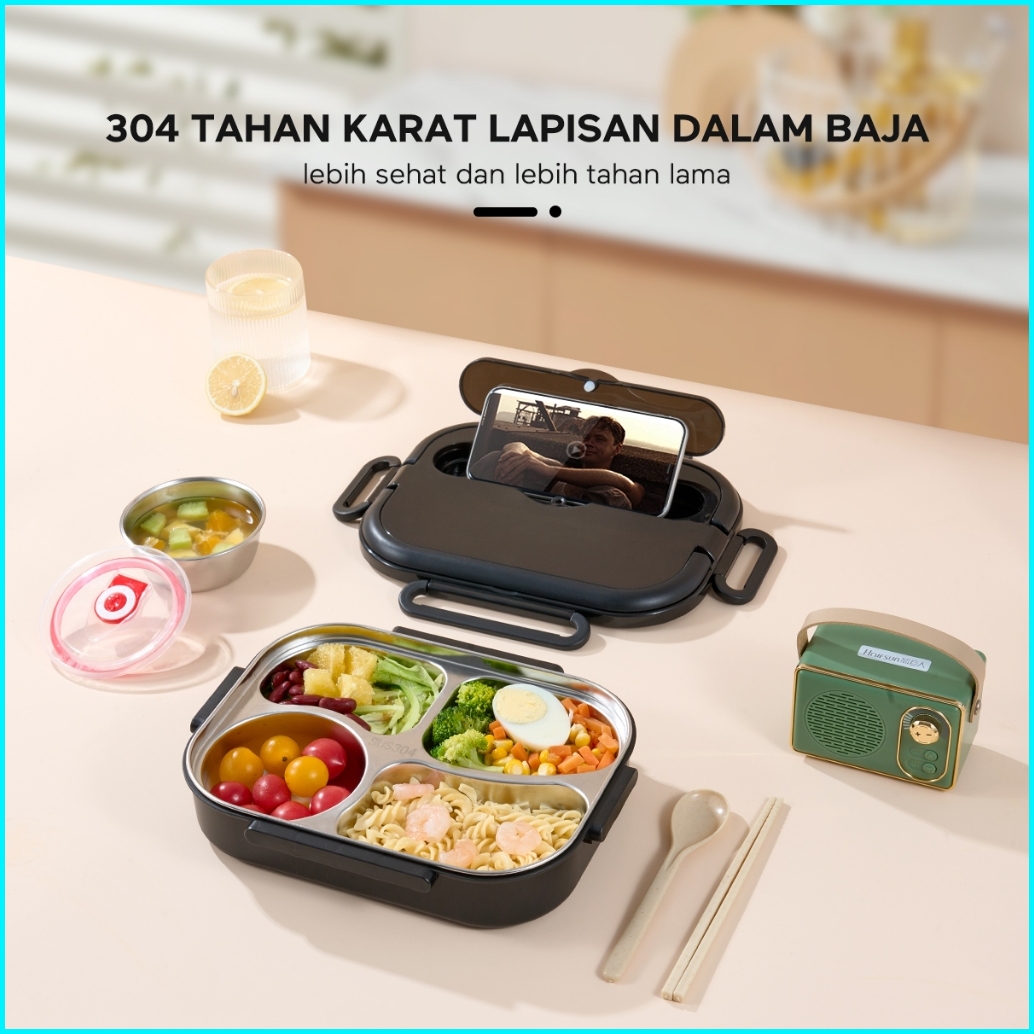 Ecentio Lunch Box 1000ml Stainless 304 Sekat 4 Dan Tempat Sup Kotak Makan Anti Tumpah Free Sendok Sumpit Hitam