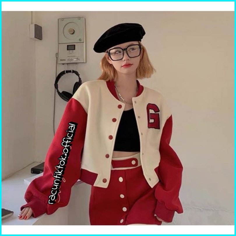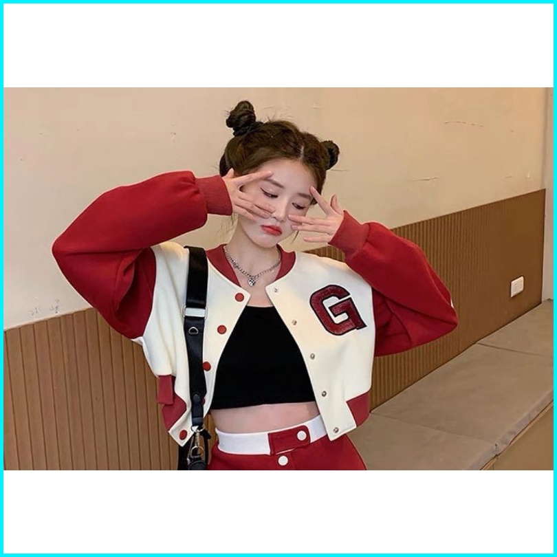 G Baseball Jaket Crop Korean Style Sweatshirt Pakaian Wanita Bahan Fleece Tebal Jaket Varsity