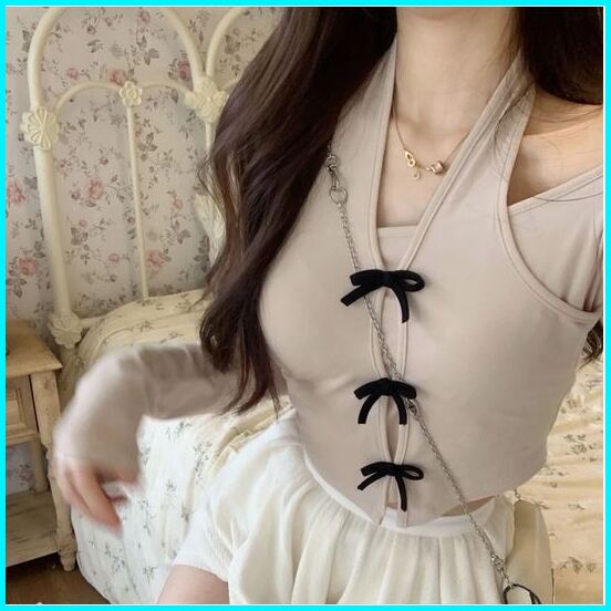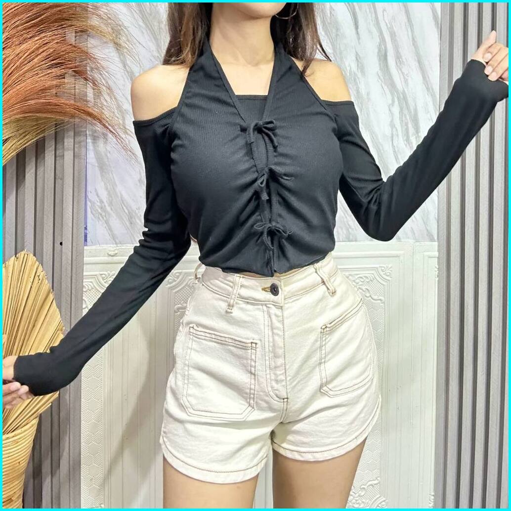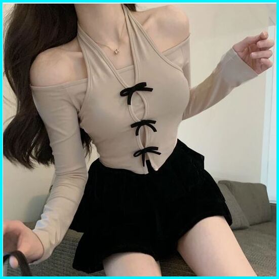 Rx Fashion - Kezia Top Coquette Knit Chery Bow Atasan Halter Satu Bahu Manis Tshirt Lengan Panjang -pn