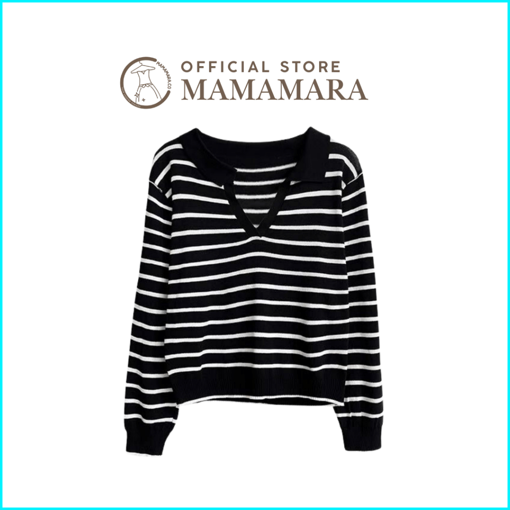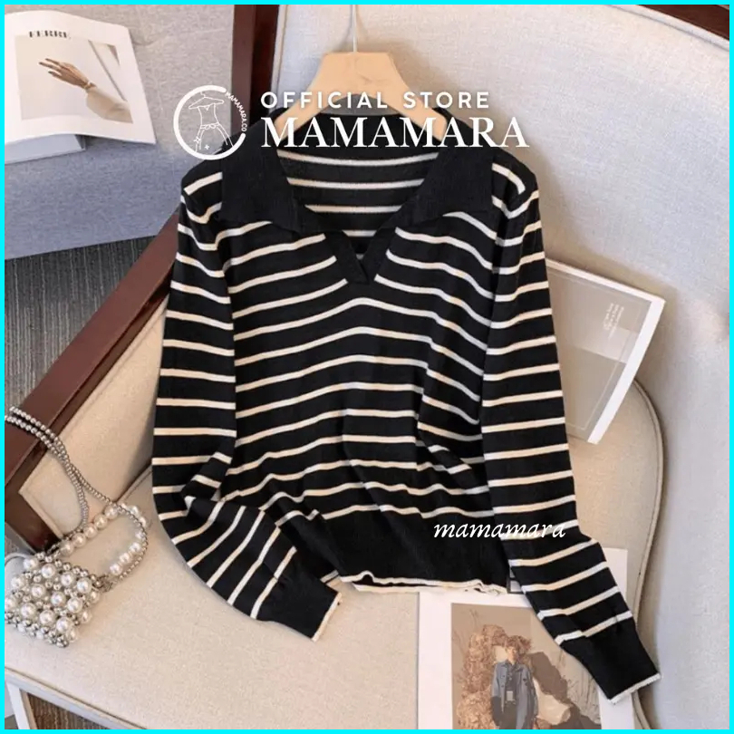Mamamara - Knitwear Sweater Crop Top Rajut Bergaris Lengan Panjang Putih Wanita Atasan