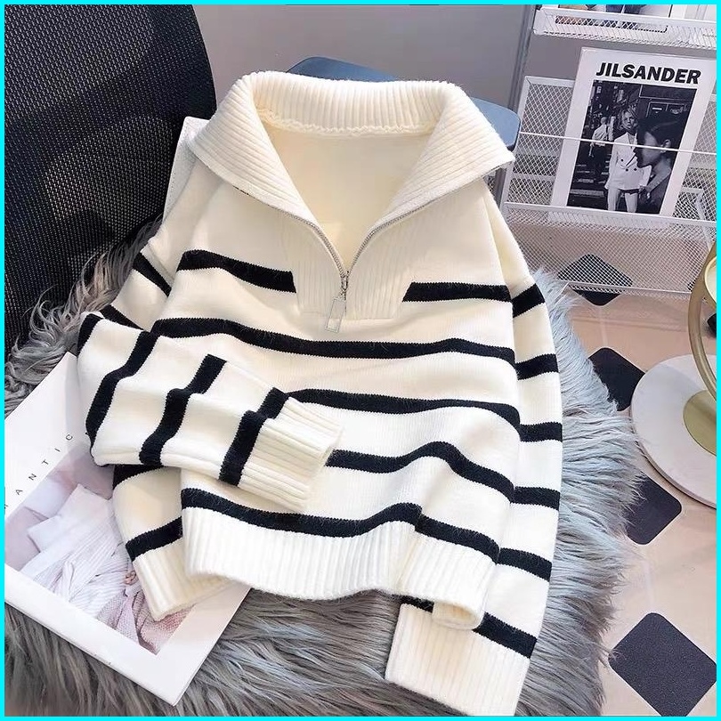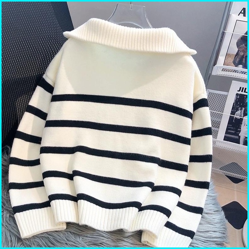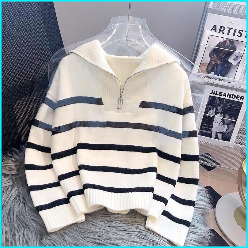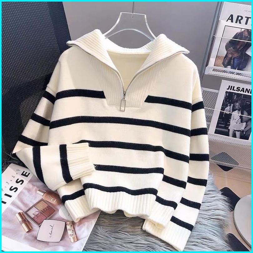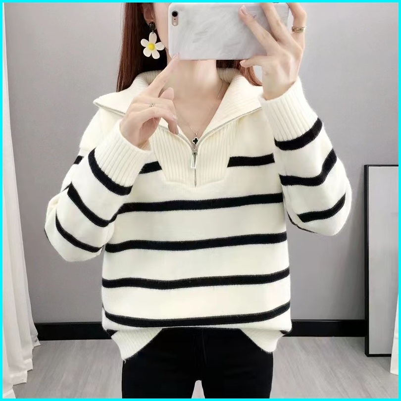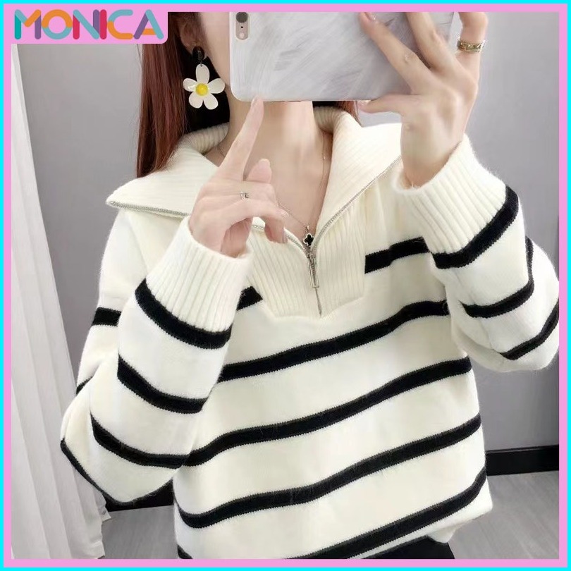 Monica Sweater Stripe Classy Zipper Rajut Wol Santai V-neck Polos Bunga Setrip Hitam Putih