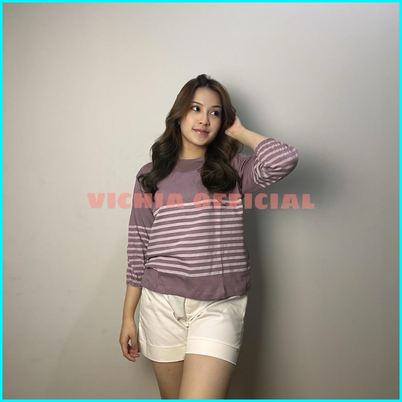 Vichia Baju Wanita Lengan Panjang Blouse Balon Salur Warna Bahan Cotton Combed