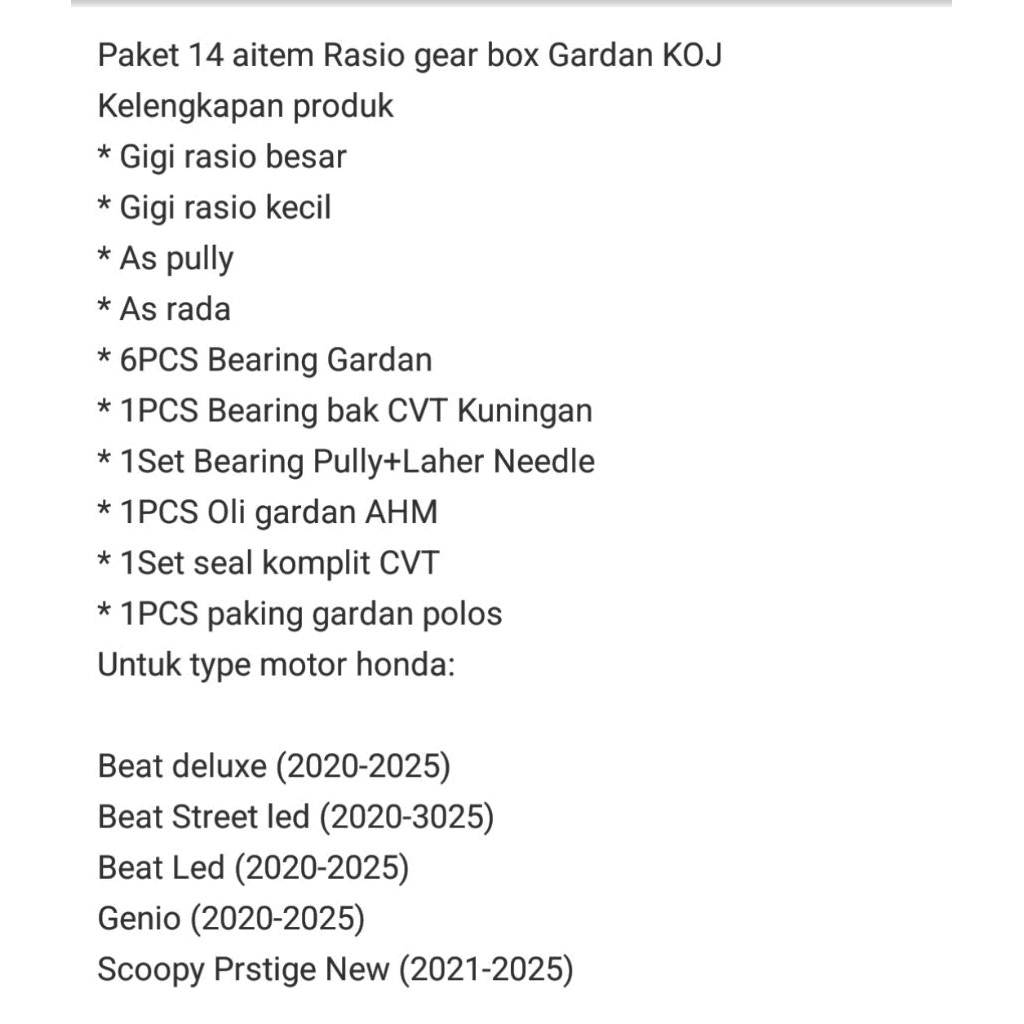 Rasio Gardan set 4PCS KOJ+10 aitem Bearing rasio KOJ Beat Deluxe Beat street Led Beat Led Genio Scoopy Prstige 2021 Oem