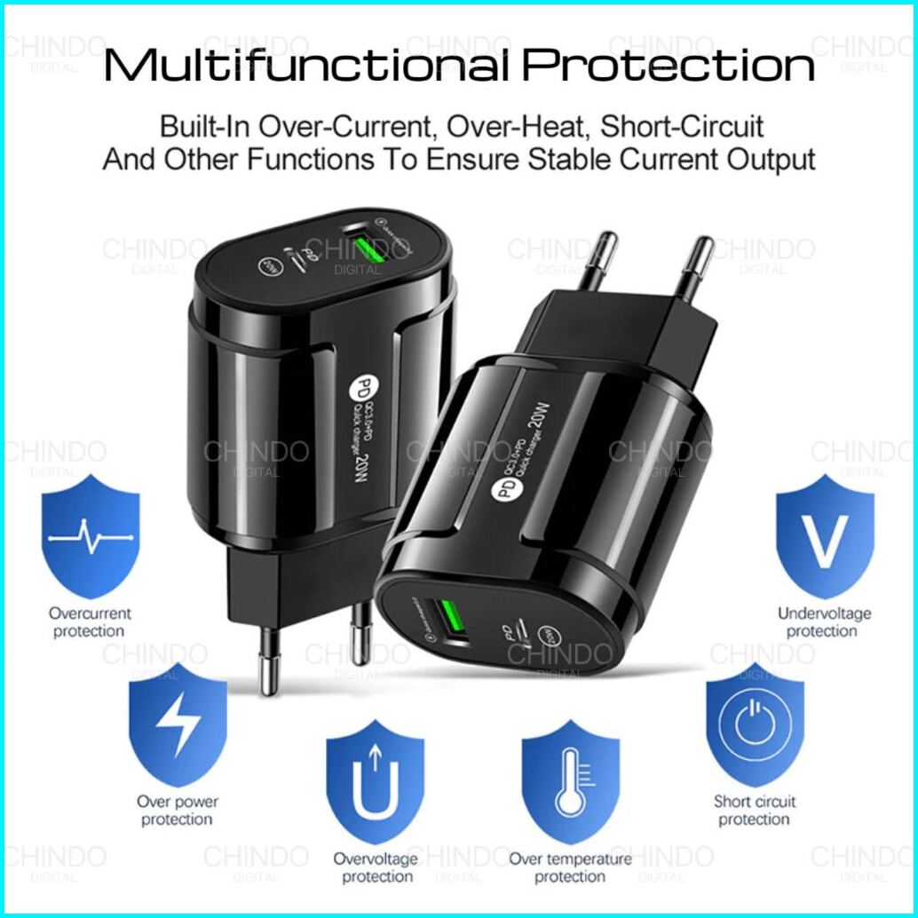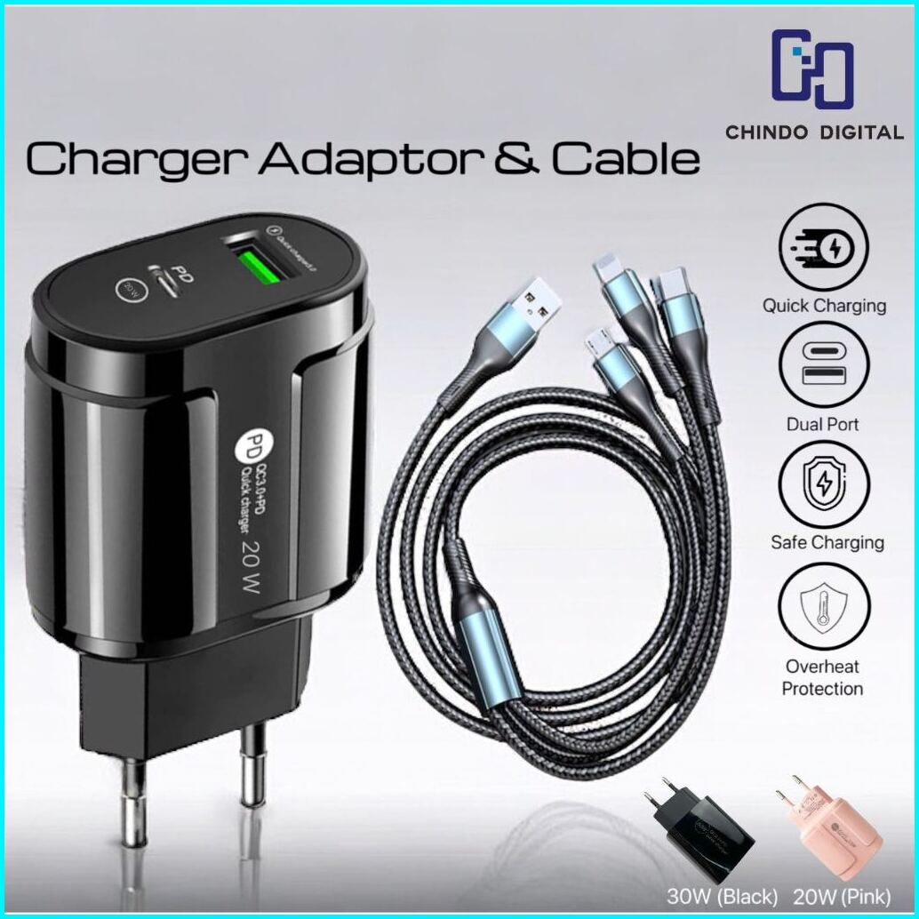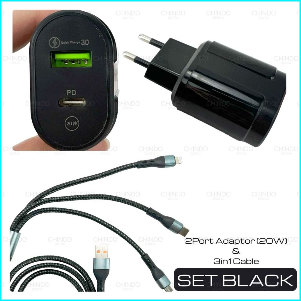 Fullset 2 Port Adaptor Fast Charger With 3in1 Cable Type C Micro Usb Lightning Adaptor Pengisi Daya Cepat Dengan Kabel 3