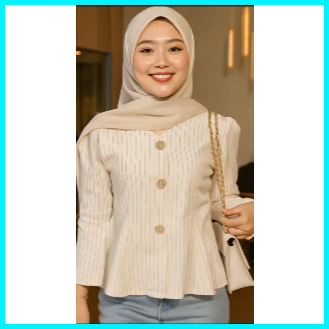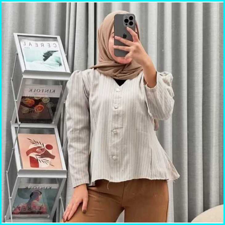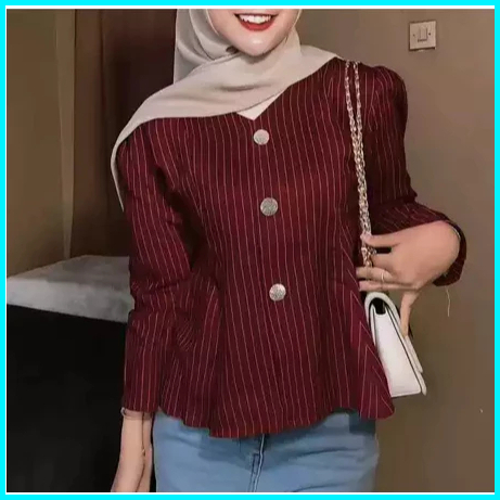 Arika Blouse Stripe Atasan Peplum Wanita Salur Lengan Puff Fit Body Fitted