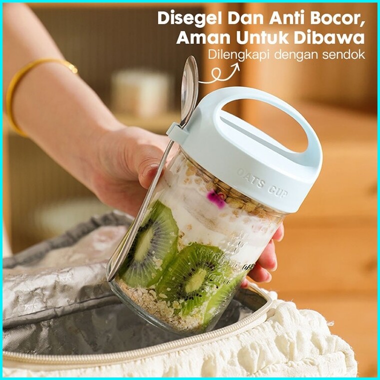 Eatkit Gelas Kaca Oatmeal 350ml Dengan Tutup Anti Tumpah Free Sendok Stainless Glass Cup Mug Salad
