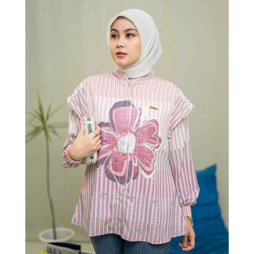 INDIRA Sandrina Top Motif Bunga Printed Premium Silk Full Kancing Ruffle Lengan Adjustable