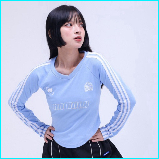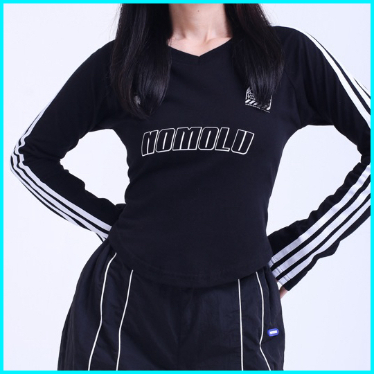 Nomolu - Croptop Long Sleeve Baju Wanita Lengan Panjang V-neck - Casual Basic Polos Kaos Stripe