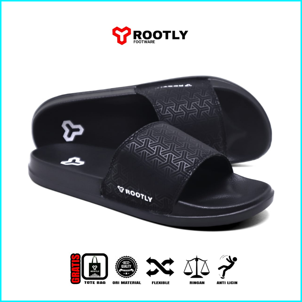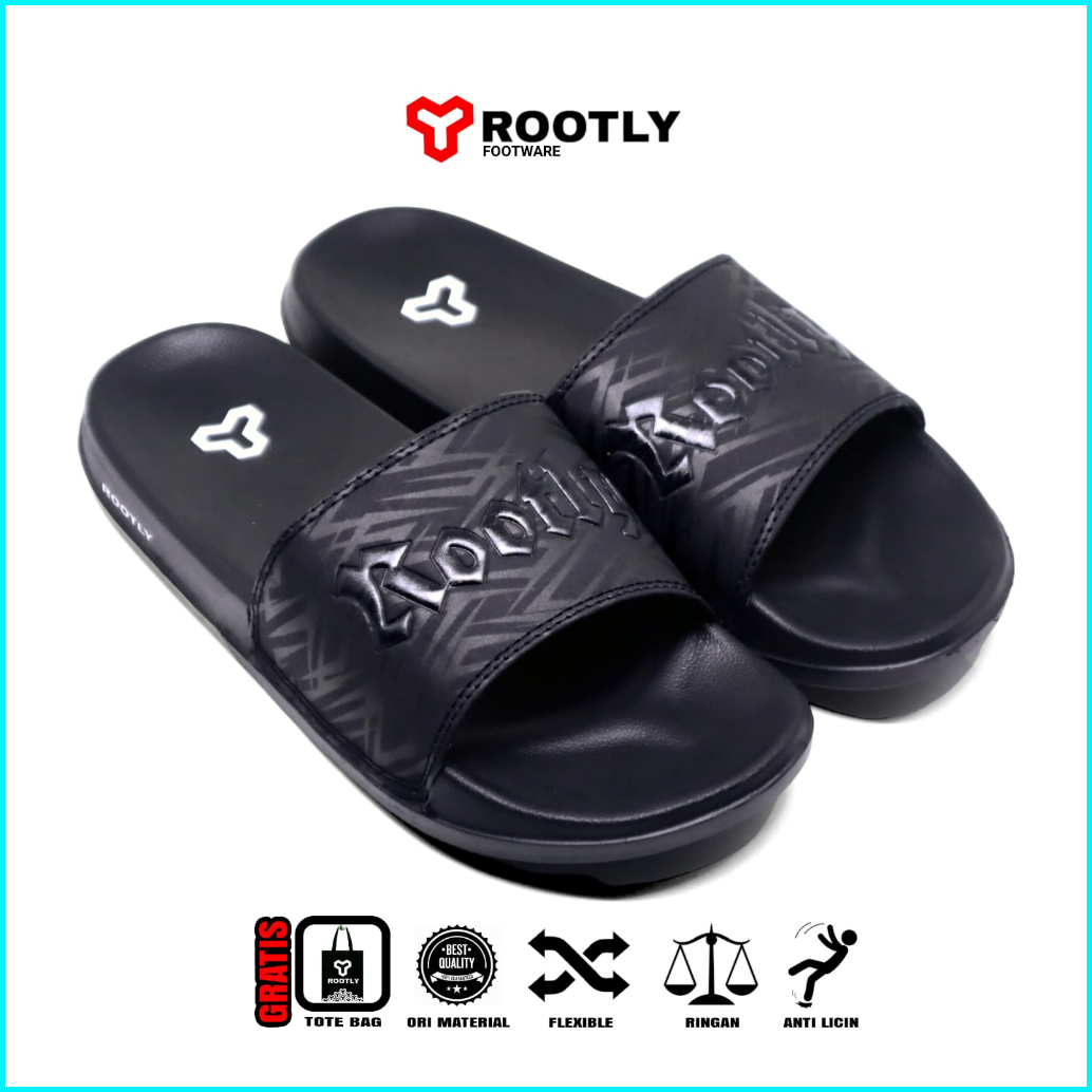 Rootly - Sandal Slipper Pria Slide On Full Black Anti Slip