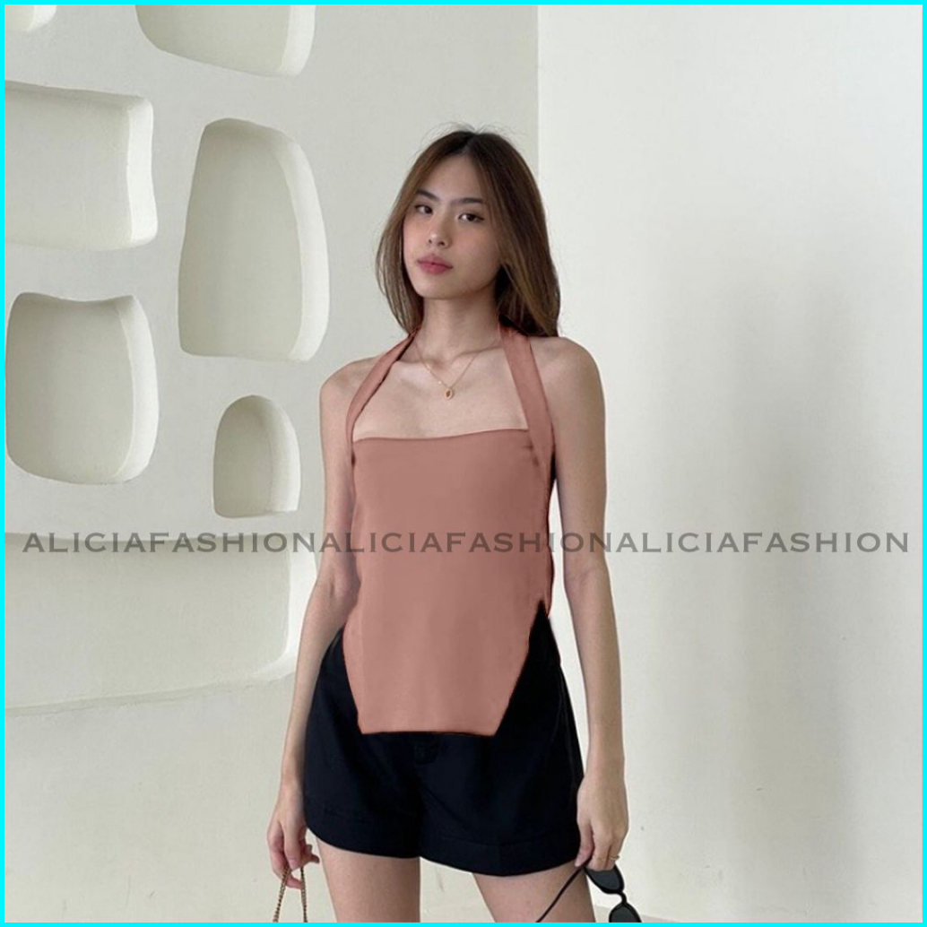Alila Tanktop Rib Halter Neckline Atasan Tanktop Sexy Wanita Bahan Rib