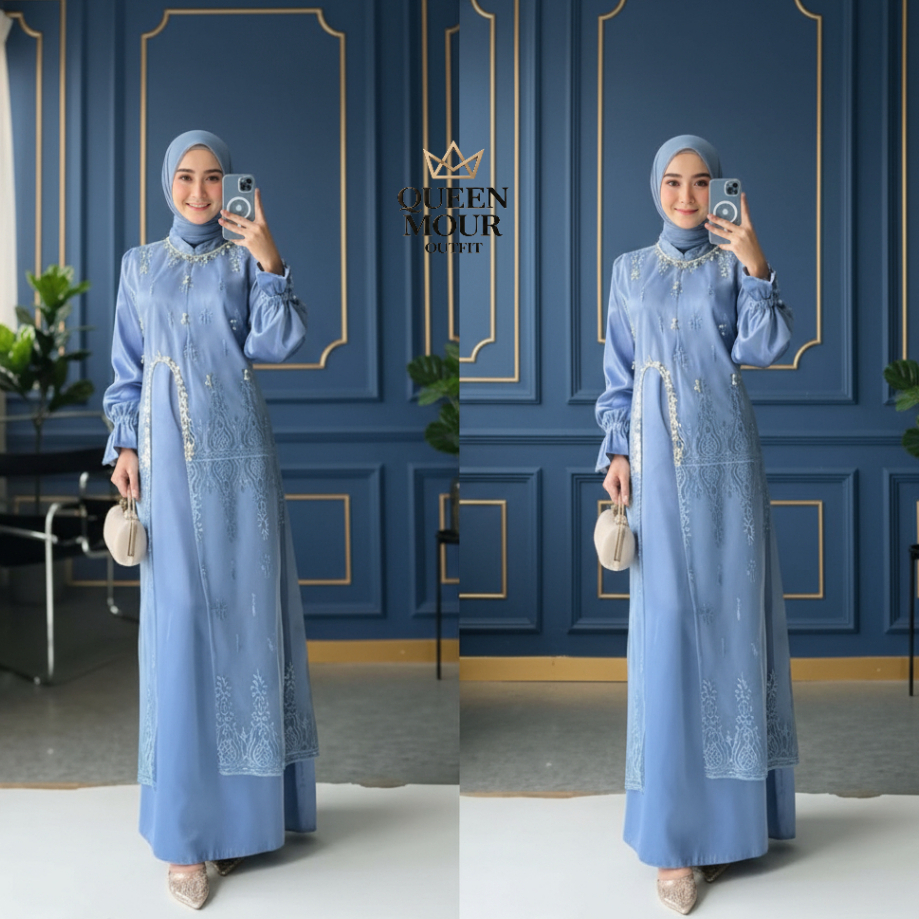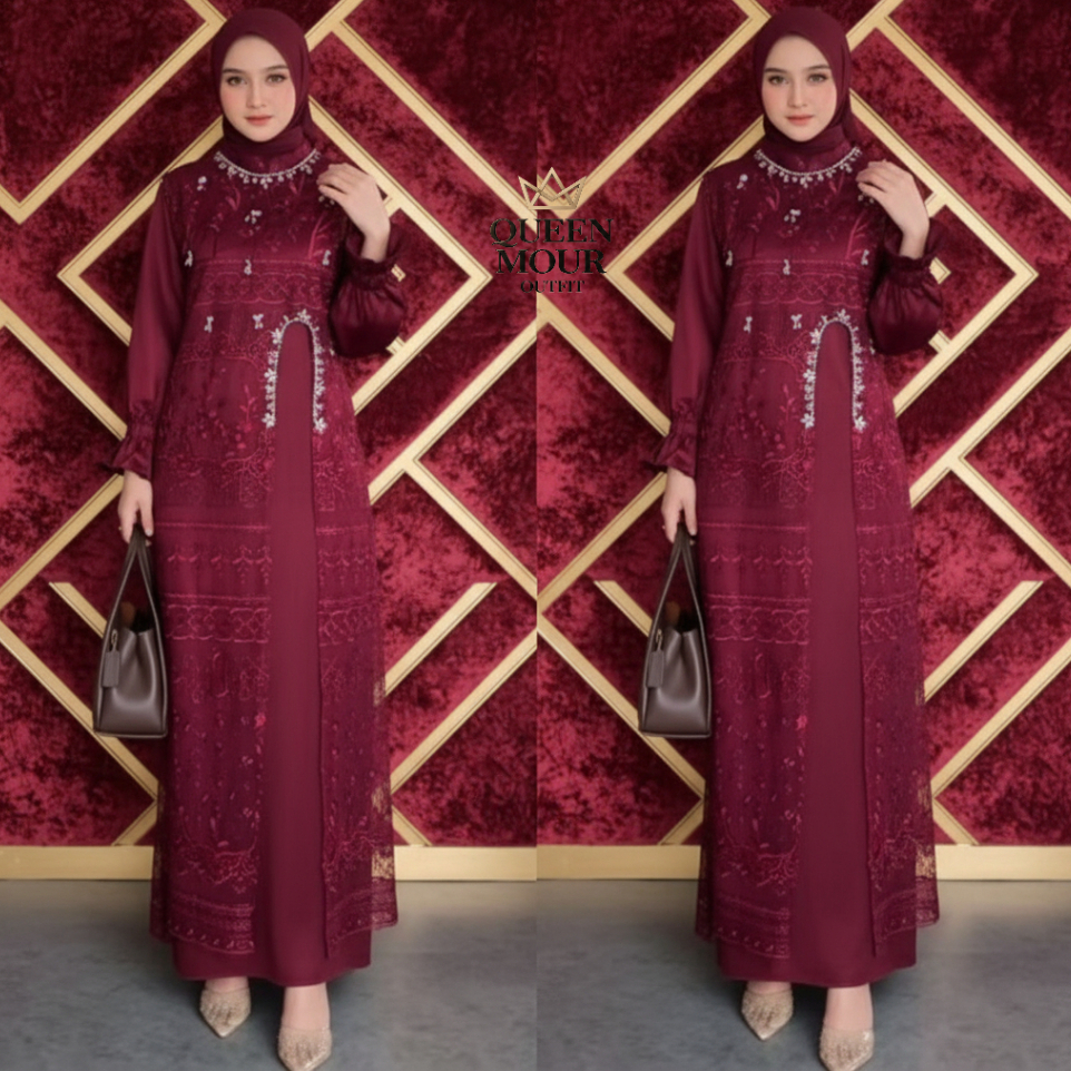 Marsya Dress Silk Burgandy Set Outer Brukat Aplikasi Payet Mutiara Gamis Pesta Wanita Kekinian OOTD