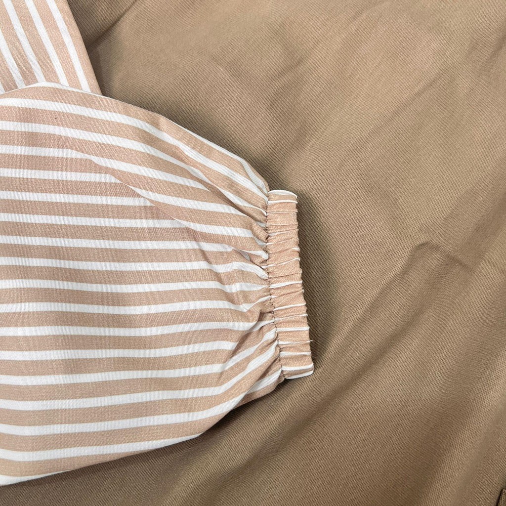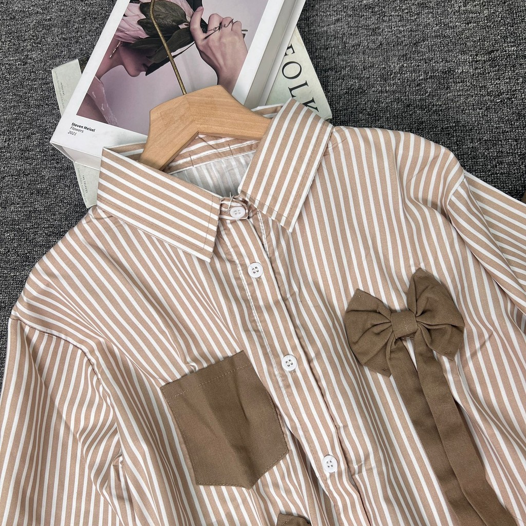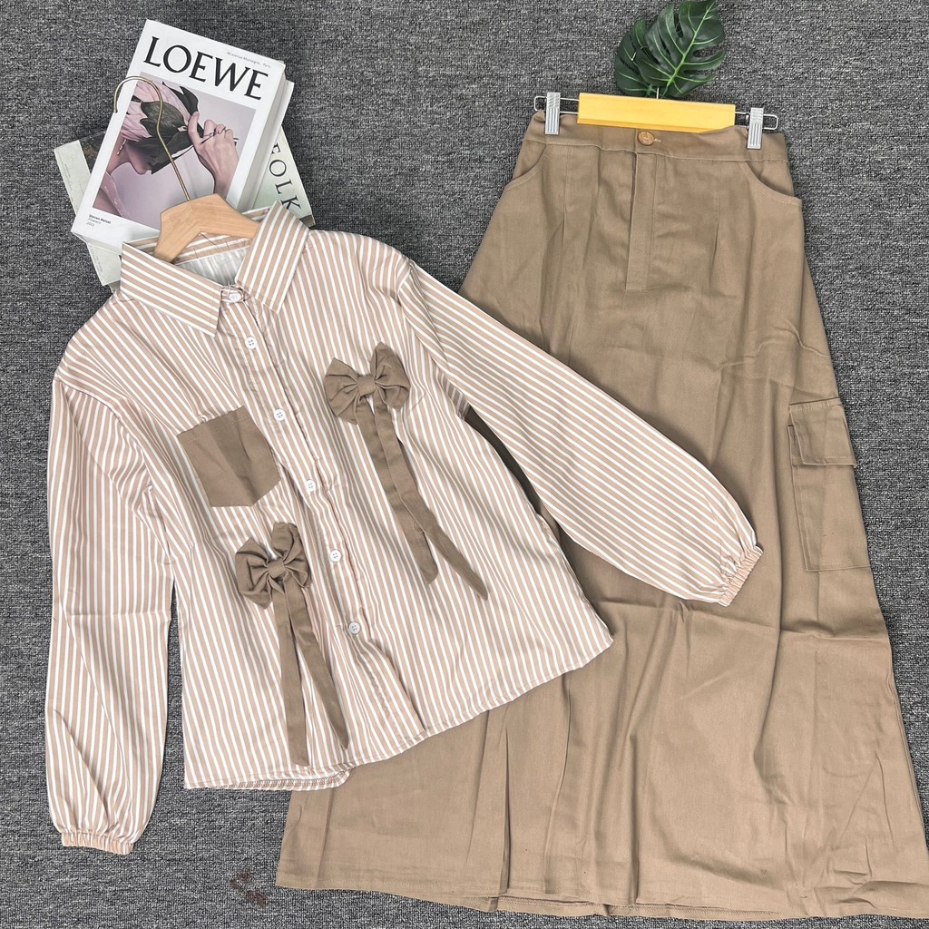 SARI FASHION PO 296 Kanaya Setrok Salur Pita Busui CHY-KANAYA-03925 Kemeja dengan Pita dan Rok Midi Warna Cokelat Muda