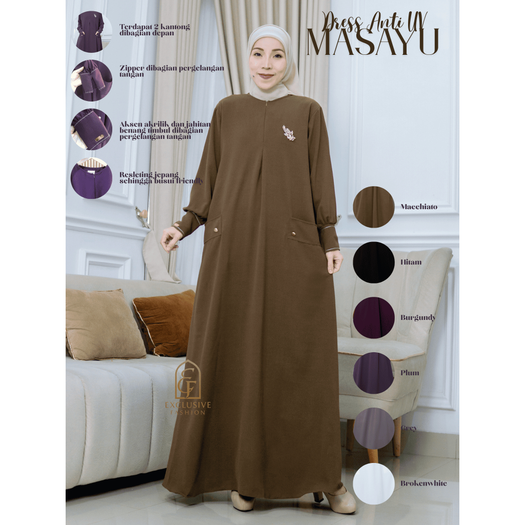 Masayu Dress Abaya Bahan Anti UV Premium Busui Friendly Zipper Tangan Combi Benang Timbul Mewah