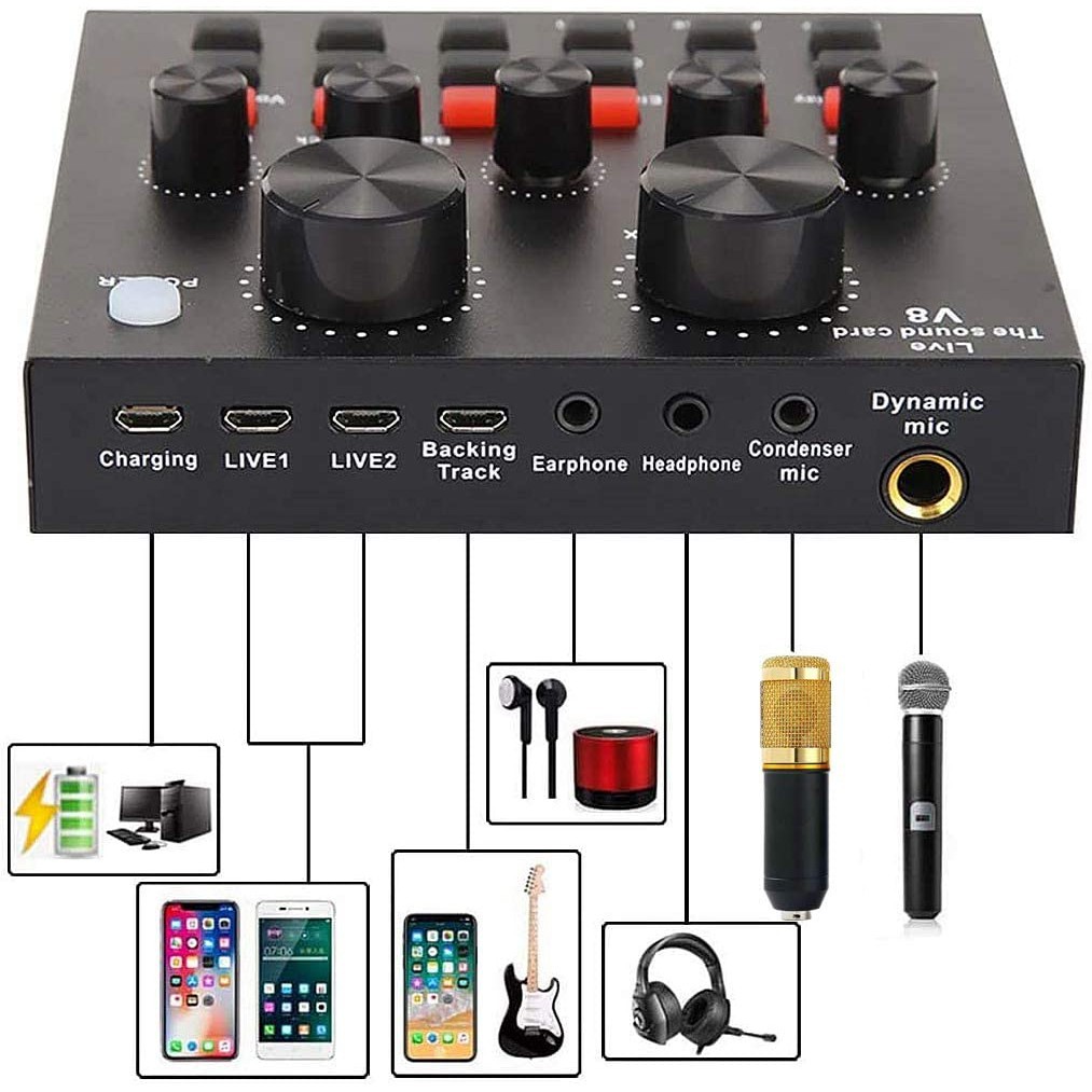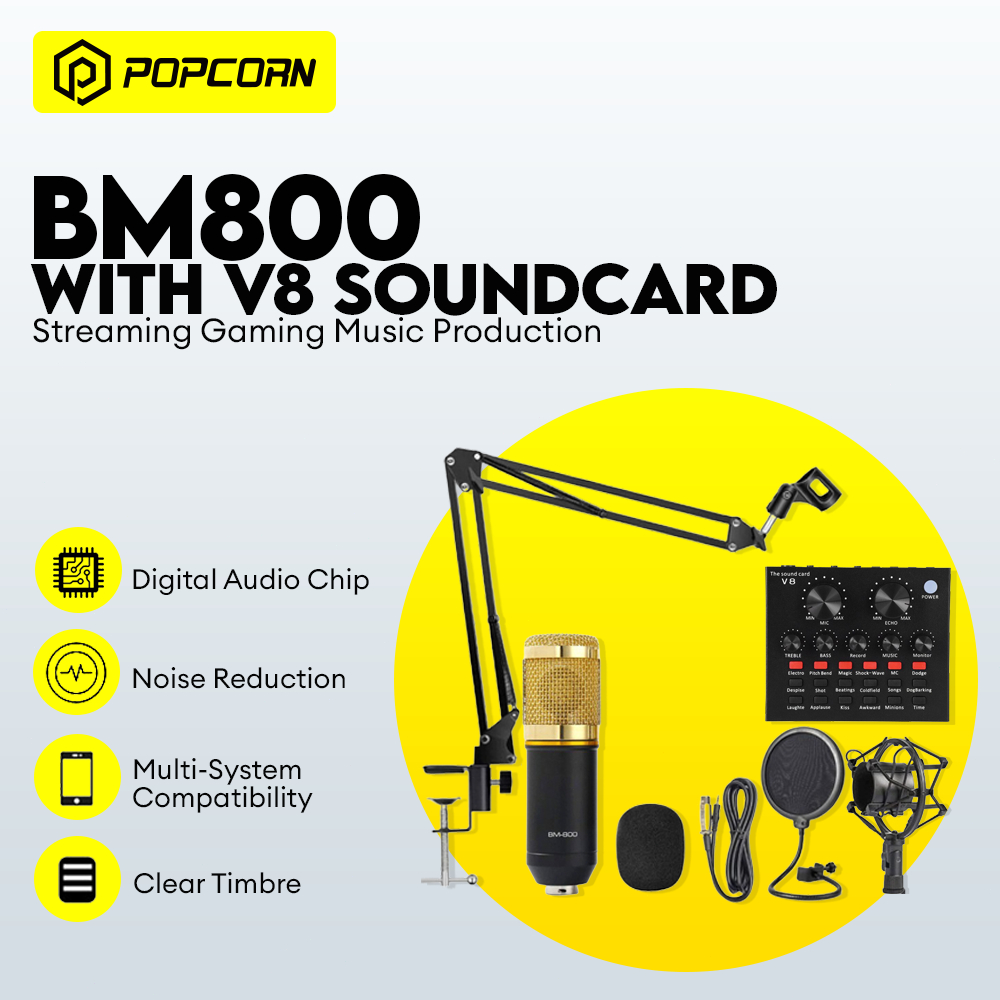 Popcorn Bm800 With V8 Soundcard Condenser Microphone Profesional Audio Kartu Suara Set Untuk Karaoke Podcast Rekaman Liv